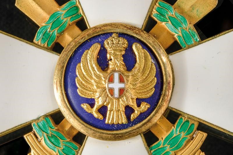 Set di gran croce; pendente in metallo dorato e smaltato, la placca in argento brillantato con centro in metallo dorato e smaltato; al verso spilla verticale e marcatura di "E. GARDINO SUCC. GRAVANZOLA ROMA".