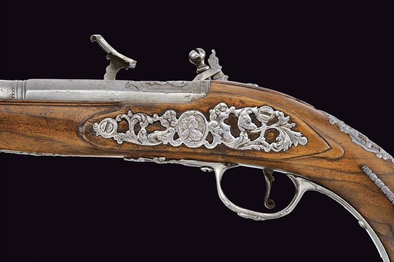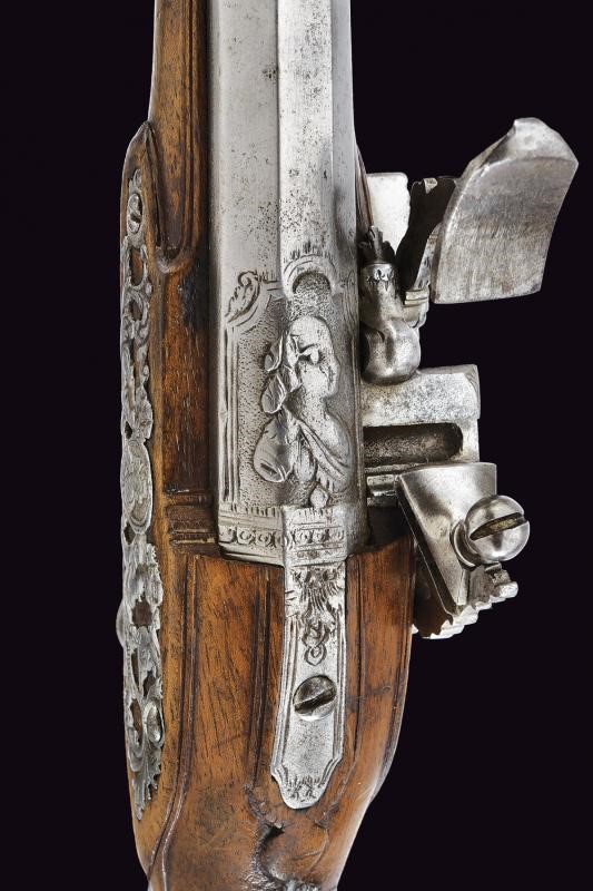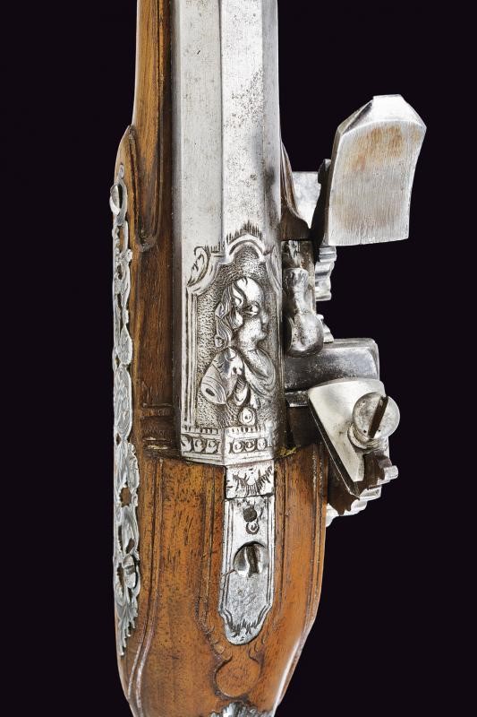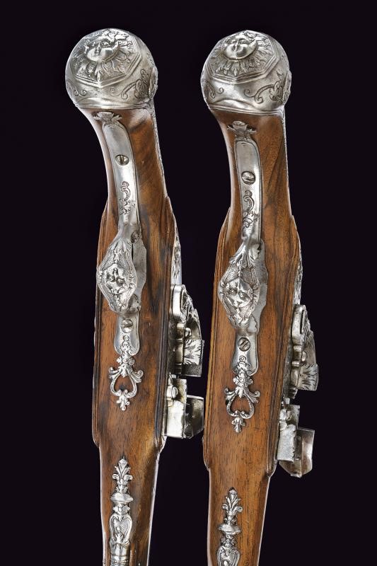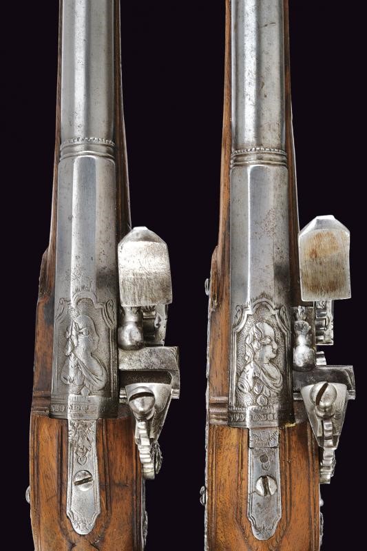 Canne lisce a due ordini, ottagonali nella prima parte, con cornice alla base e busto intagliato, al cambio anellature, poi con un segmento a sezione circolare, la volata incisa, cal. 11.5 mm. Codette in un unico pezzo con le canne (rottura restaurata in una pistola) decorate a motivi floreali. Belle batterie alla fiorentina, cartelle piatte incise a racemi, le code e le teste delle viti dei cani con mascherone in rilievo; cani e martelline intagliati a testa di drago ed incisi a motivi floreali, copriscodellini scorrevoli; all'interno delle cartelle le firme "G.G". Casse intere in legno chiaro con bei fornimenti in ferro incisi, intagliati e parzialmente traforati a mascheroni, busti e a motivi floreali. Bacchette in legno con cavastracci in ferro.