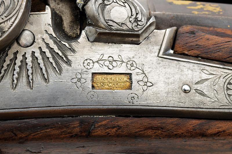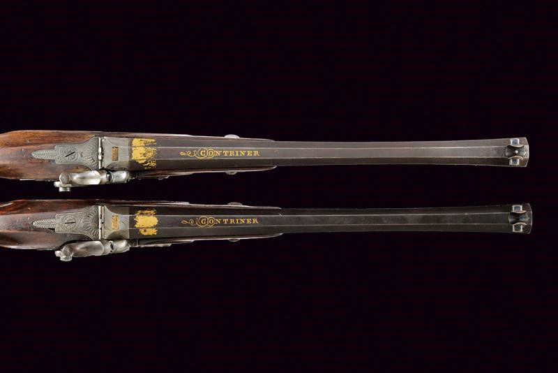 Eleganti lunghe canne rigate (anime con leggera ruggine superficiale, rigature ben visibili), con marca rettangolare "CONTRINER IN WIEN" e numerate "1" e "2", firmate "CONTRINER" in oro e con resti di doratura alla culatta; le volate strombate e munite di mirino di precisione e resti di banda in oro, cal. 11 mm. Larghe codette finemente incise e munite di traguardo ad un foglietta abbattibile. Batterie a molla in avanti finemente incise e con la medesima marca. Mezze casse in legno, scolpite a fogliame nella parte anteriore e con zigrinatura al calcio. Fornimenti in ferro incisi en suite. Piccolo scudetto in argento con monogramma "BM" al dorso. Ponticelli con poggiadito. Stecher. Da cassetta quindi prive di alloggiamento per bacchetta.