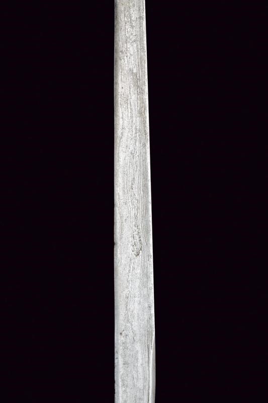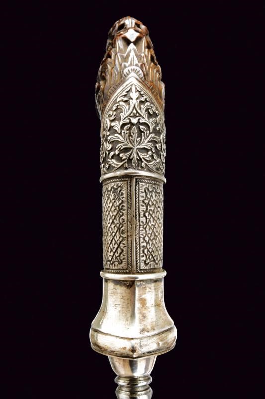 Robusta lama dritta a un filo e controfilo leggermente crescente verso il debole, la base con nodo a disco. Fornimento con pomo in corno finemente intagliato e traforato a motivi floreali, l'impugnatura rivestita in lamina d'argento elegantemente sbalzata a motivi floreali su fondo scuro. Fodero in legno liscio.