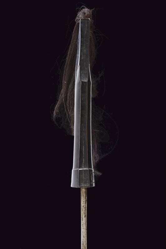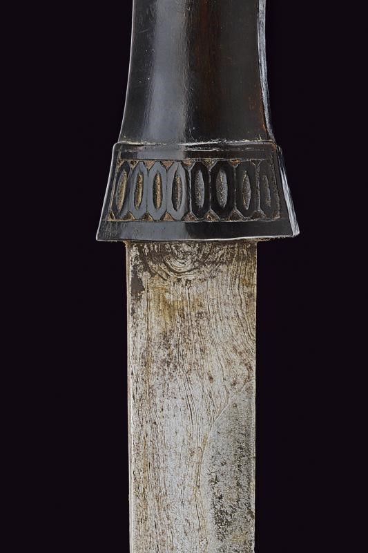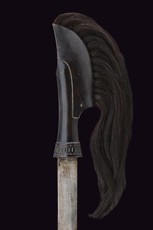 Lama dritta a un filo in pamor (XVIII o XIX secolo). Fornimento in legno scolpito e dotato di lunghi ciuffi in crine di cavallo. Fodero in legno in due pezzi, la parte superiore e il puntale scolpiti a motivi geometrici, la parte centrale rivestita con bande in rattan.
