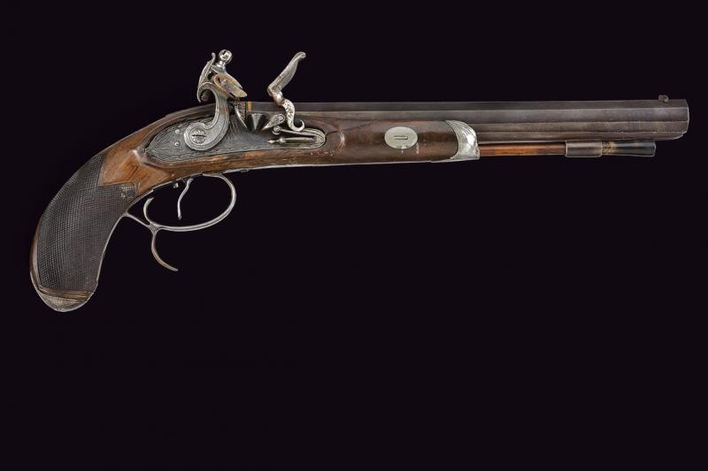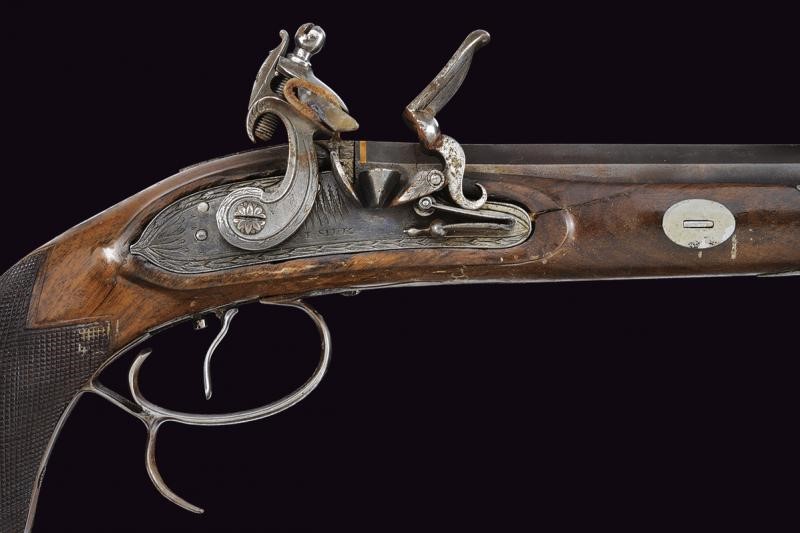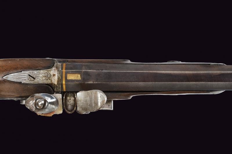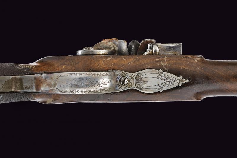 Canna ottagonale liscia, brunita; la culatta con cornice e marca di Silk in oro. Mirino, cal. 10 mm; codetta incisa e munita di alzo brunito. Batteria a pietra focaia firmata "I. SILK", incisa a motivi floreali e munita di sistema antifrizione e a tenuta stagna. Mezza cassa (due restauri) in legno con calcio zigrinato; fornimenti in ferro decorato en suite. Ponticello con poggiadito, grilletto con stecher. Bacchetta in legno con battipalla in corno.