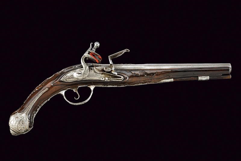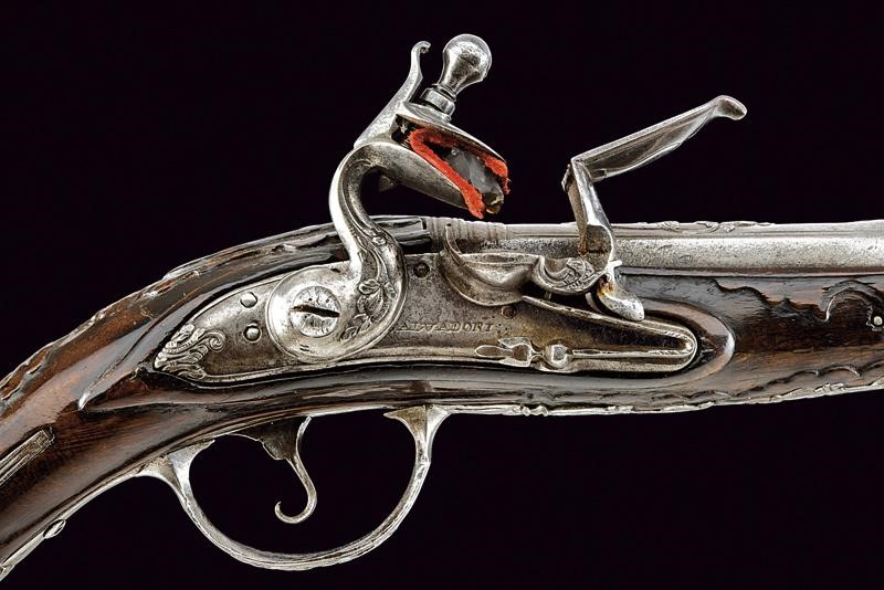 Canna liscia, tonda, con base quadra decorata con cornici ed una ghirlanda di fiori in bassorilievo, bindella firmata "L. LAZARINO" con estremità intagliate a fogliame, cal. 15 mm in volata. Codetta incisa. Batteria con cartella tondeggiante firmata "S. SALVADORI" e con coda, scodellino (a tenuta stagna) e cane intagliati a racemi. Cassa intera in legno leggermente scolpito. Fornimenti in acciaio decorati en suite con la canna. Bacchetta in legno con battipalla in ferro.