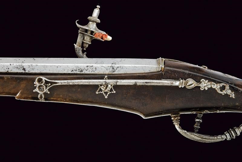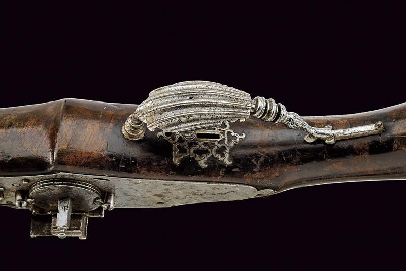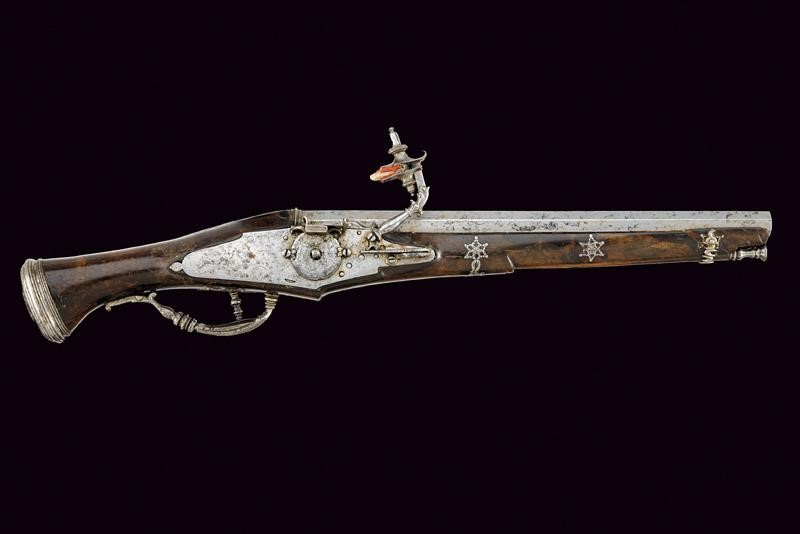 Canna ottagonale liscia, con cornice alla culatta, cal. 14 mm. Batteria a ruota esterna con cartella piatta munita di copriscodellino scorrevole e cane intagliato a motivi floreali, all'interno marca ovale "IS" sotto tre stelle. Cassa intera in legno (piccoli restauri e segni d'uso e del tempo) con fornimenti in ferro parzialmente traforati, il ponticello decorato a scanalature e a balaustro (alcuni danni da ruggine). Gancio da cintura con punta traforata. Bacchetta in legno con battipalla in ferro.