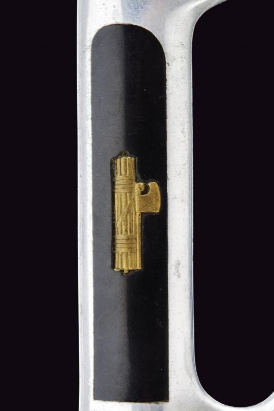 Lama dritta a un filo e controfilo (zone con ruggine); impugnatura in alluminio a testa d'aquila; guancette nere e fascio littorio in ottone. Fodero annerito (difetti) con fornimenti in ottone e due anelli di sospensione.