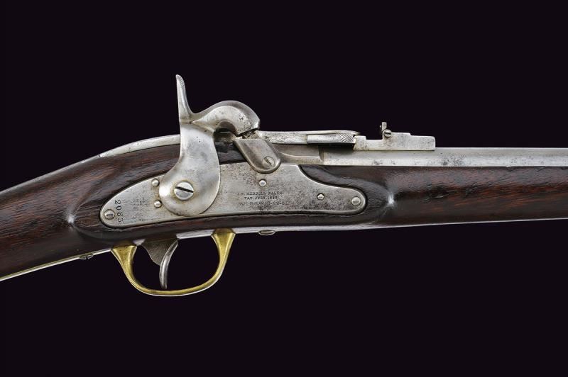 Round, rifled, 54 cal. barrel. Clean bore with visible rifling, some pitting inside. Rear sight, foresight with two foldaway leaves. Sliding-block bolt with typical lever opening on the back of the barrel marked "H. J. MERRILL BALTO./PAT. JULY 1858". Breechloading mechanism with percussion primer. Lock marked "H. J. MERRILL BALTO./PAT. JULY 1858/APL. 9 MAY 21-28-61" and with serial number “20xx” (also on the lever.) Walnut stock, probably with remains of a military order stamp above the sling swivel. Brass mounts and patchbox. Iron sling swivel. Some pitting and small signs of use and time.