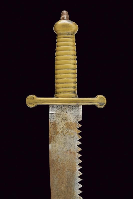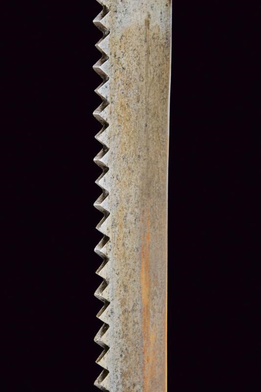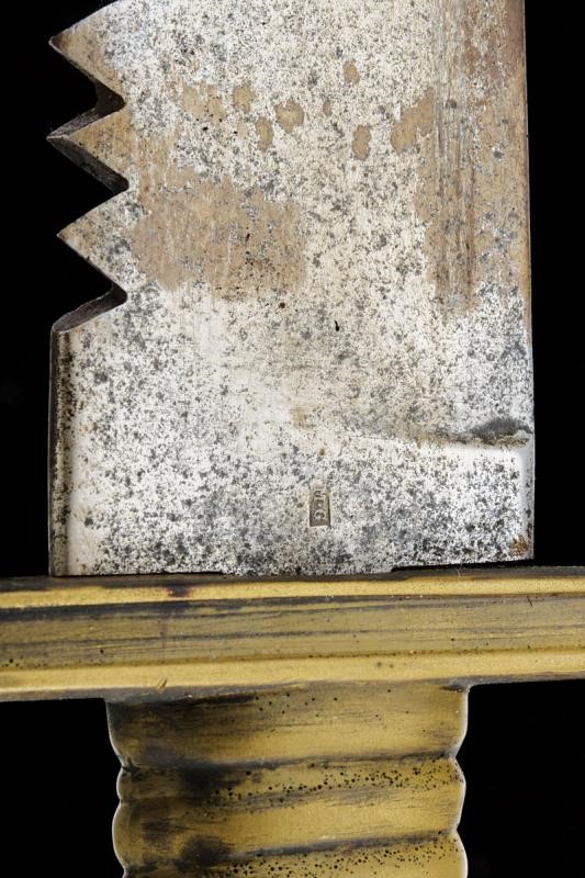 Larga lama dritta a un filo e corto controfilo, dorso a sega; tallone con punzone "MG". Tipico fornimento in ottone massiccio. Fodero in cuoio con fornimenti in ottone, completo di taschetta in cuoio.