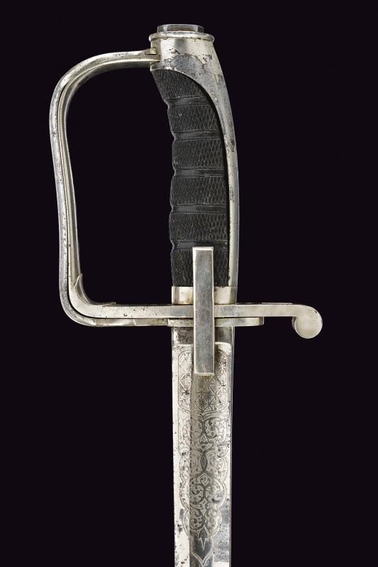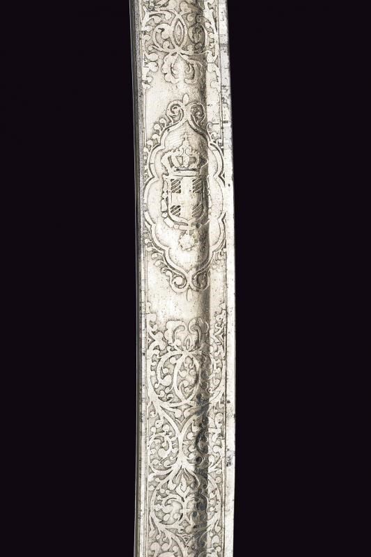 Curved, single-and false-edged blade, nickel-plated, with fuller, engraved with cartouches depicting racemes on half of the length, the Savoy coat of arms on one side, the motto "VIVA L'ITALIA UNA" on the other; iron hilt with guard provided with turning quillon (!), smooth long cap, black grip with checkered sectors; rectangular langets. Without scabbard.