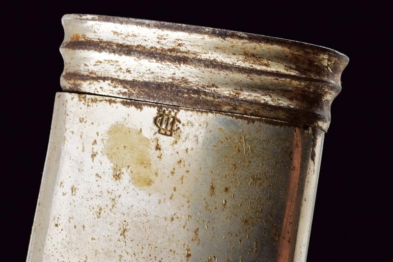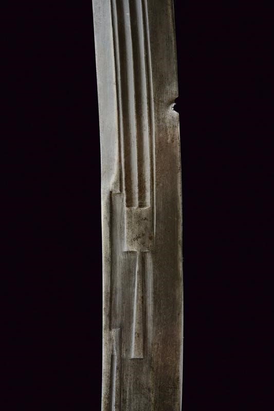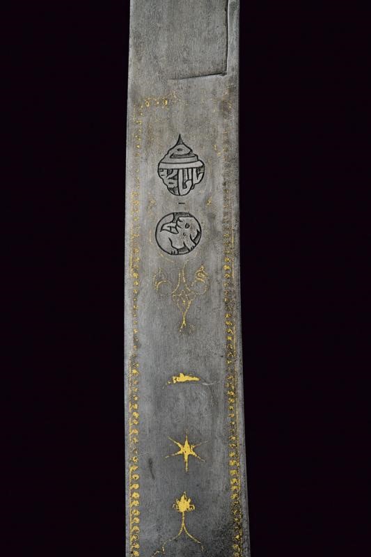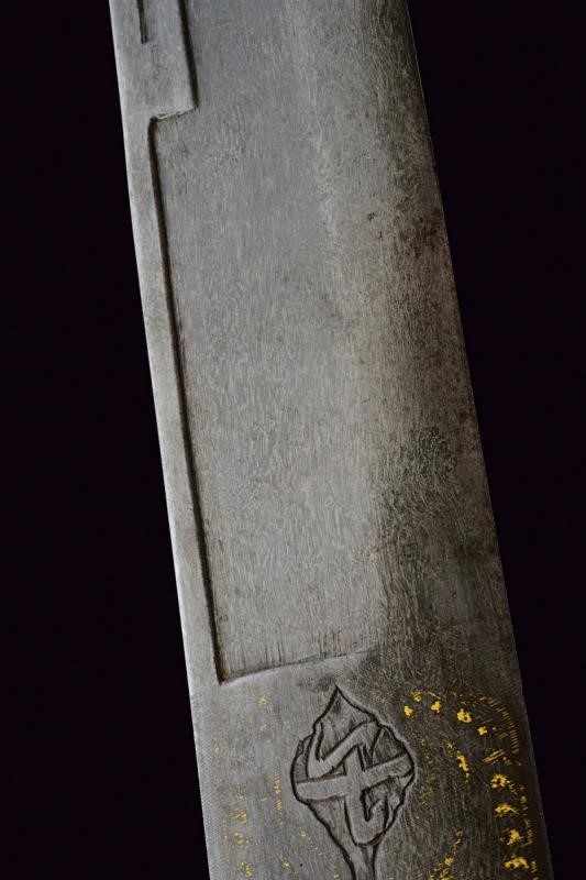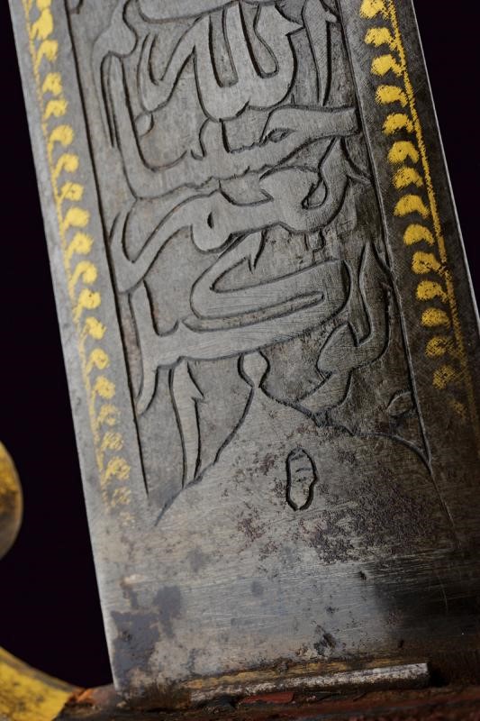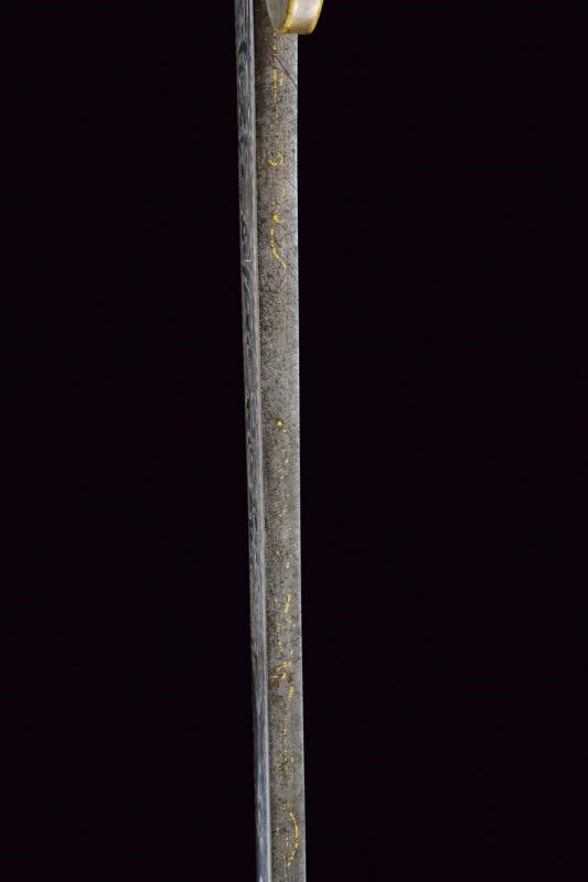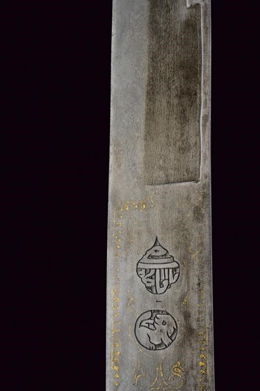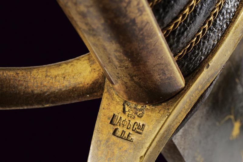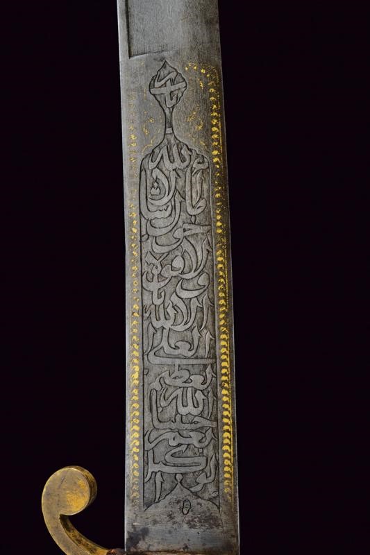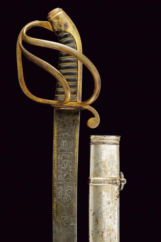 Bellissima lama Persiana in fine damasco, a un filo (con forti intaccature nella parte inferiore) e controfilo, con scanalatura dorsale nella parte centrale e con doppia scanalatura al debole; la prima parte recante sul lato di terza una lunga iscrizione in caratteri arabi entro cornice dorata, sul lato opposto due cartigli e resti di decorazioni in oro. Tipico fornimento in ottone, braccio di parata a ricciolo con marcatura della manifattura "Shaff & Sons a Pietroburgo", alla sommità della cappetta monogramma "M E" sotto corona. Fodero in ferro (piccola mancanza) nichelato con marca sotto la cappa, due anelli di sospensione.