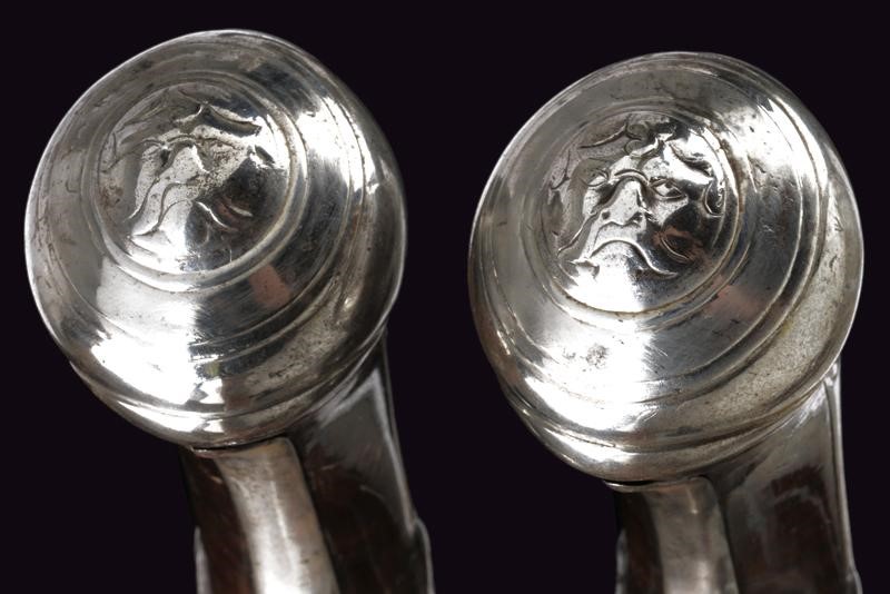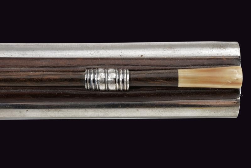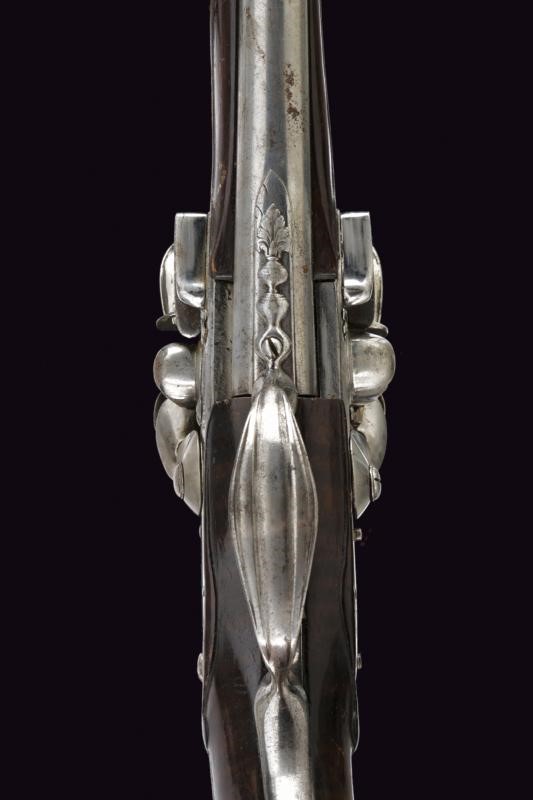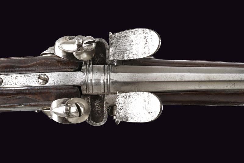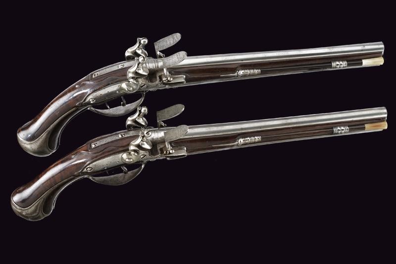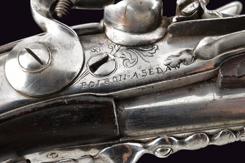 Canne tonde, lisce con culatta quadra e base decorata ad anellature, cal. 13 mm; codette incise a fiorame; lunghe batterie a pietra focaia firmate "BOIRON A SEDAN" ed incise en suite; casse intere in radica con fornimenti in ferro, ponticelli scanalati, cocce decorate a mascheroni. Bacchette in legno con battipalla in corno chiaro.