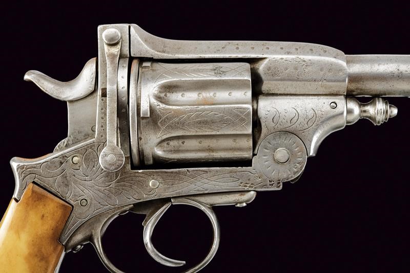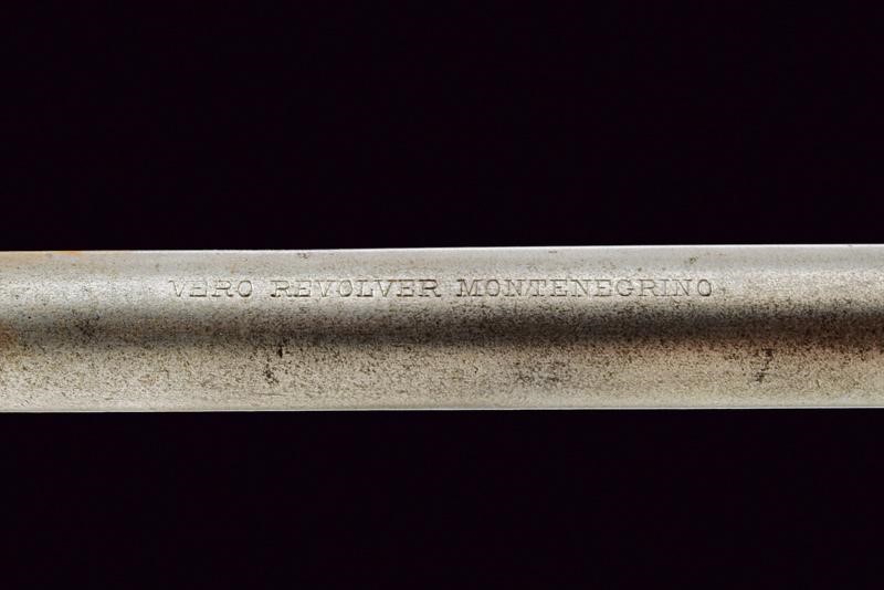 Canna tonda rigata (rigatura visibile, qualche intaccatura all'interno), marcata al dorso "VERO REVOLVER MONTENEGRINO", sul lato sinistro "ADLERS PATENT / GUSS STAHL" e con matricola "16xx", dotata di mirino, cal. 11 mm in volata. Tamburo a sei colpi inciso a motivi geometrici e con punzoni. Davanti al cane sono poste due leve trasversali alla canna che permetto di ruotare il castello di novanta gradi in modo da caricare o estrarre le pallottole; estrattore automatico funzionante ma con meccanica da rivedere. Meccanica funzionante in singola azione, doppia azione da rivedere. Marcatura "S.MARKE", punzone "S" e "Z" sotto stella. Guancette in corno di mucca (piccola crepa). Anello porta correggiolo.
