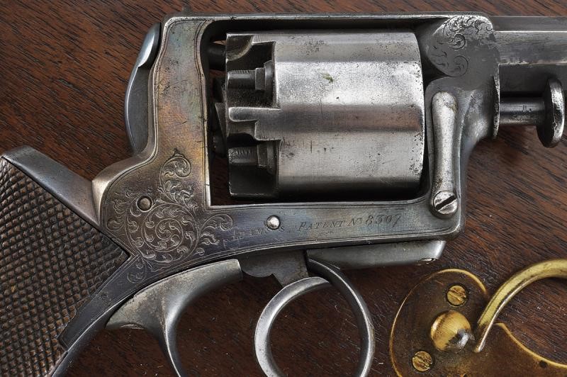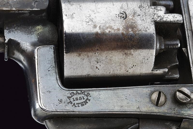 Canna ottagonale rigata dotata di mirino, marcata al dorso "MANUF.D BY PIRLOT BROTHERS LIEGE ... BY DEANE ADAMS & DEANE LONDON" (la parola al centro non leggibile), cal. 11 mm. in volata. Varie intaccature e incrostazioni all'interno. Tamburo a sei colpi con punzone "PF". Castello con incisioni a racemi e marcatura del brevetto Adams. Meccanica funzionante, rotazione da rivedere. In una cassetta in legno con interno in panno verde (rifoderato?) e munita di alcuni accessori.