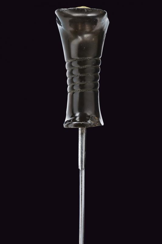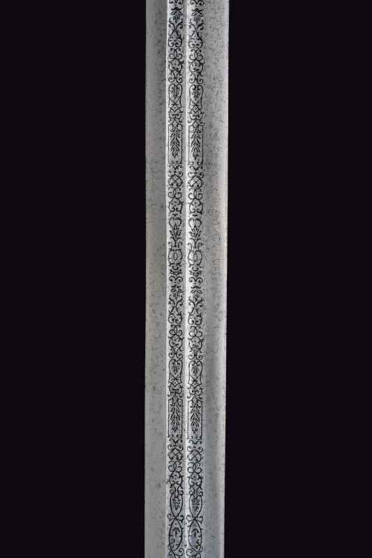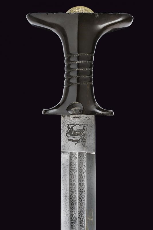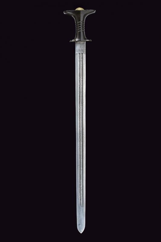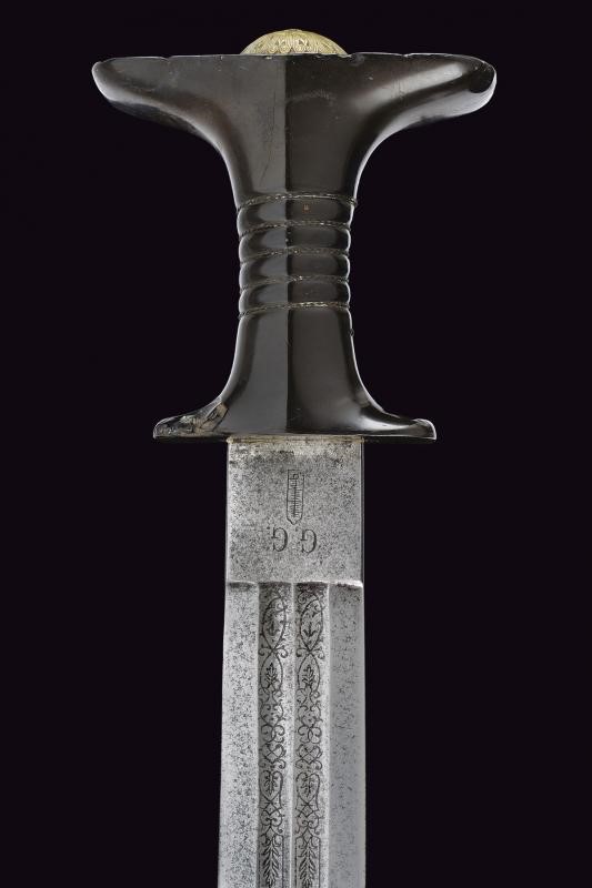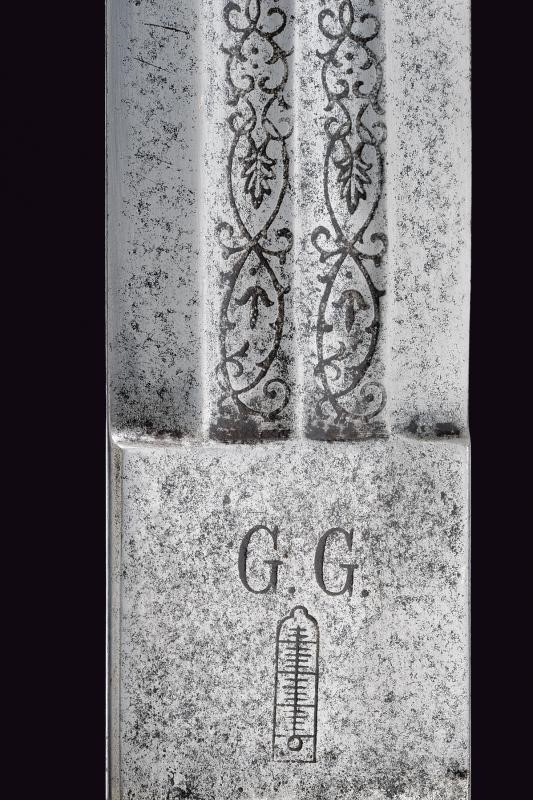 Bella e larga lama a due fili dotata di doppia scanalatura a tutta la lunghezza finemente incisa a motivi floreali, tallone rettangolare marcato su un lato "G.G." e sull'altro con leone di Giuda inciso. Massiccia impugnatura a doppia "T" in bachelite (mancanze), cappa semisferica in ottone, incisa a motivi geometrici.