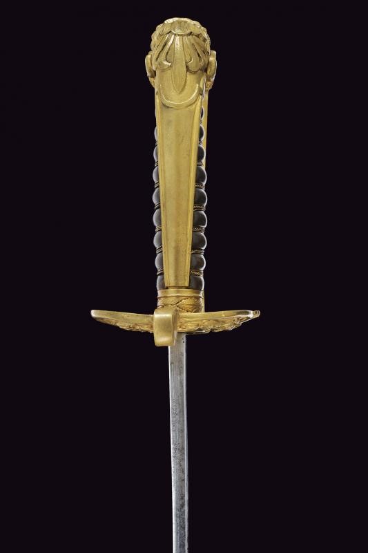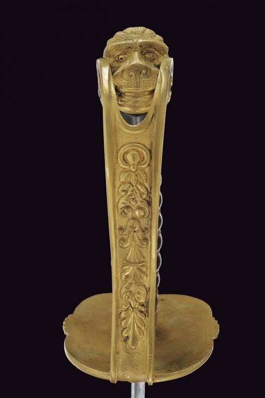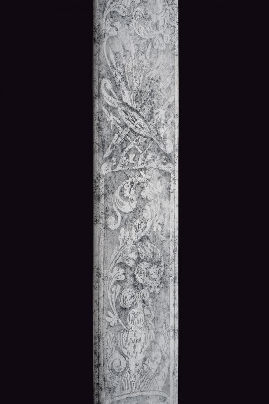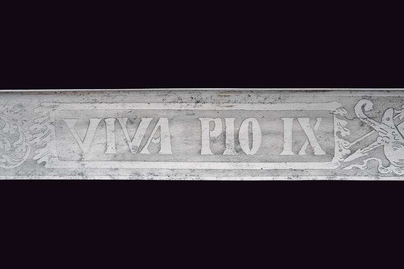 Bella lama dritta a un filo e controfilo, prima piatta poi con duplice scanalatura, la parte piana finemente incisa a trofei, fiorami e con motto "VIVA PIO IX". Fornimento in bronzo con guardia piatta, parzialmente decorata a motivi floreali, cappetta lunga a testa di leone, resti di doratura, impugnatura in corno con trecciola metallica. Fodero in ferro a due campanelle, con fornimenti in bronzo.