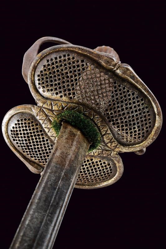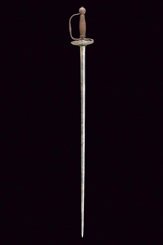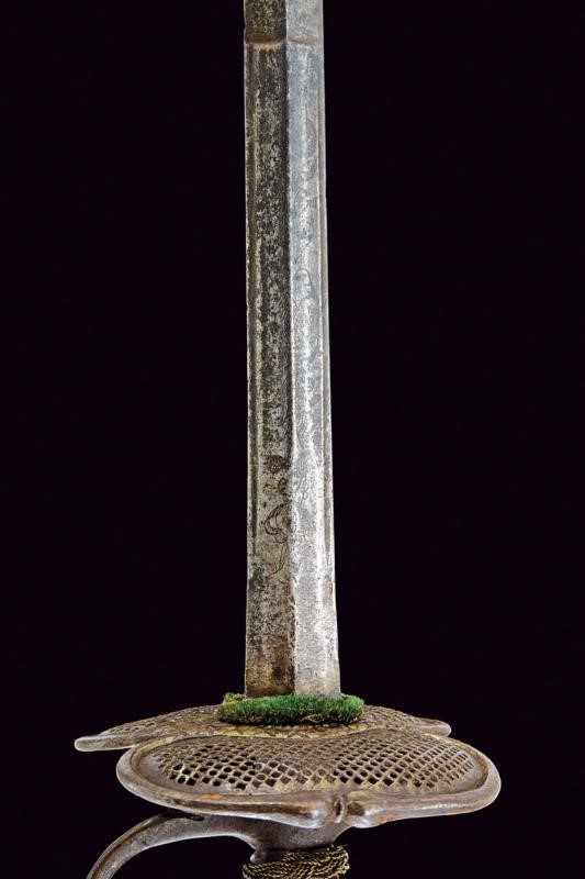 Lama dritta a due fili di sezione a losanga, leggermente intagliata alla base ed incisa a motivi floreali. Fornimento in ferro con doppia valva traforata e pomo a urna con intagli nella parte superiore e scanalature longitudinali nella parte bassa. Impugnatura in legno rivestita con trecciola e dotata di teste di moro in filo metallico. In patina.
