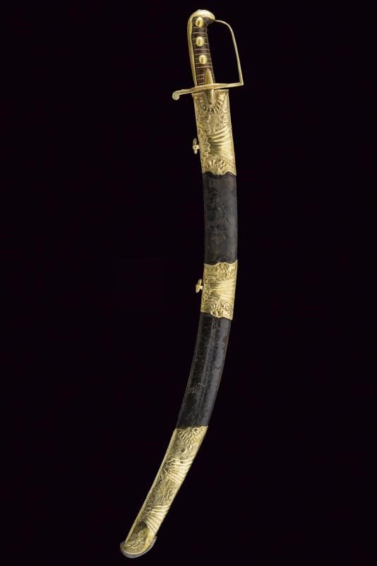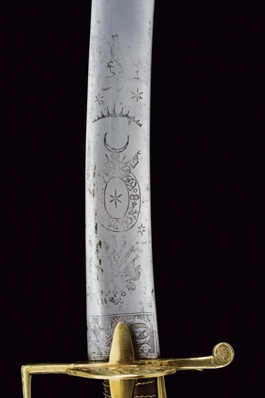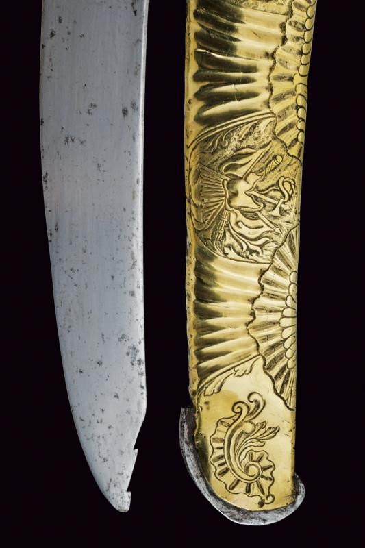 Imponente e larga lama a un filo e controfilo, con lieve sguscio; la punta con due denti; la base incisa a trofei, con sole, stelle, luna, testa di pandur e simboli cabalistici; il dorso inciso a riccioli. Monumentale fornimento in bronzo dorato; l'elso munito di alette fermafodero e due valve finemente decorate a trofei in bassorilievo su fondo granulato; il largo ramo di guardia decorato a palmette; il pomo decorato en suite con il ramo di guardia, il lungo dorso della cappetta con trofei. Impugnatura in legno rivestita di cuoio, con trecciola in filo d'ottone, su entrambi i lati tre rivetti convessi, sempre in ottone. Fodero in legno rivestito di cuoio (mancanze) con tre fornimenti in ottone dorato, magistralmente incisi a trofei, rocaille e con scanalature. Due grandi anelli di sospensione, vela in ferro. Arma rarissima e di gran qualità, estremamente rara da trovare in queste dimensioni e con lavorazione di così gran pregio.