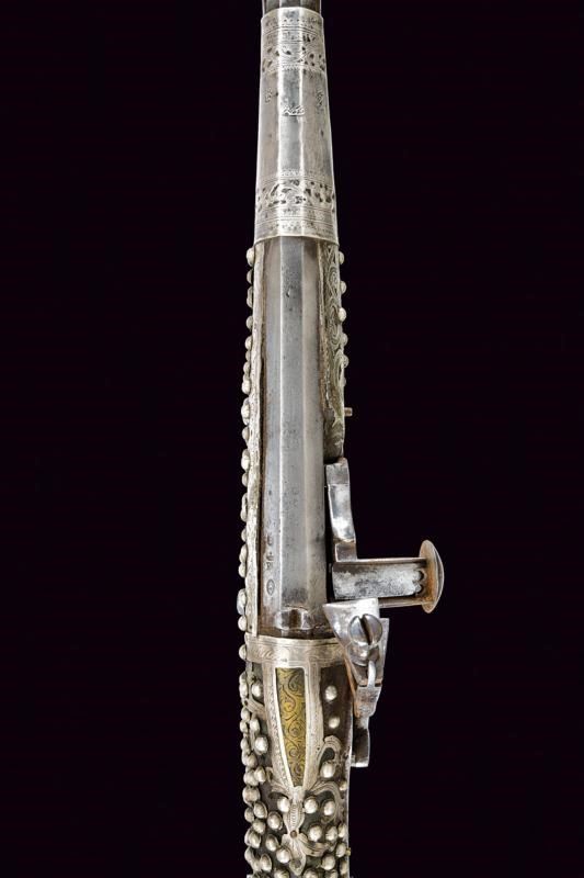 Canna liscia ottagonale, culatta con punzone del banco di prova di Londra e alzo; la volata strombata e con mirino in ottone; cal. 14 mm. Codetta rivestita con lamina d'ottone incisa a motivi floreali. Batteria snaphaunce a pietra focaia, martellina mancante. Cassa intera in legno riccamente decorata con placche e fornimenti in argento, parzialmente traforati ed incisi (con vari punzoni); il calcio realizzato in osso di cammello inciso e parzialmente colorato; piccole mancanze e difetti. Bacchetta in ferro con battipalla intagliato.