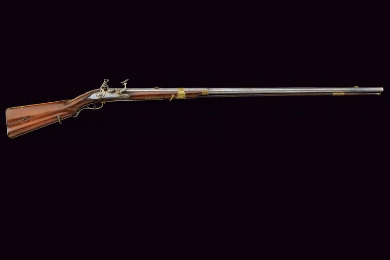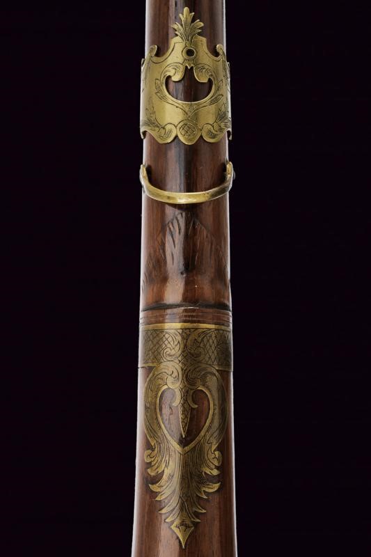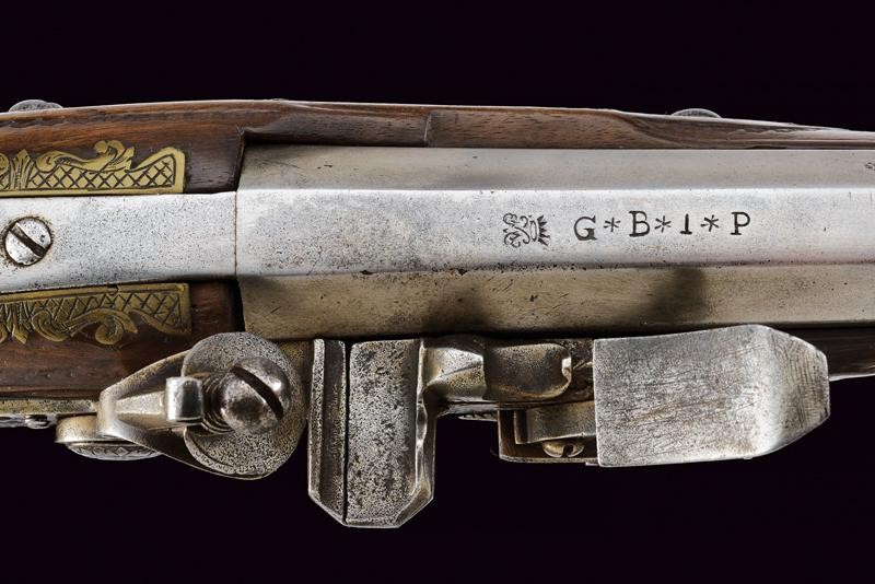 Canna liscia a due ordini, prima ottagonale, con marca "G B I P" (le lettere suddivise da tre stelle) e con monogramma poco leggibile sotto corona, dotata di alzo a sella in ottone, poi tonda con anellature al cambio, mirino in ottone, cal. 19 mm. Batteria alla fiorentina incisa con maschere grottesche e a motivi floreali, con copriscodellino scorrevole; all'interno della cartella marca "al Filigare". Mezza cassa in legno con bei fornimenti in bronzo riccamente incisi, con busti e decori floreali, la contropiastra firmata "IL CORSINI". Bacchetta in legno con battipalla in ottone e cavastracci in ferro.