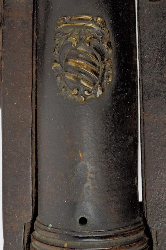 Canna in bronzo decorata con anellature e gioia di bocca, al di sotto del focone la data "1733", al di sopra uno stemma con ovale munito di tre segmenti obliqui sormontati da un galero. Bellissimo affusto coevo in legno con grandi ruote a raggi, con fornimenti in ferro; la parte centrale dell'affusto decorata con bandelle terminanti in gigli. Ai lati ganci per attrezzi. Piccolissime mancanze. Raro.