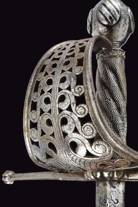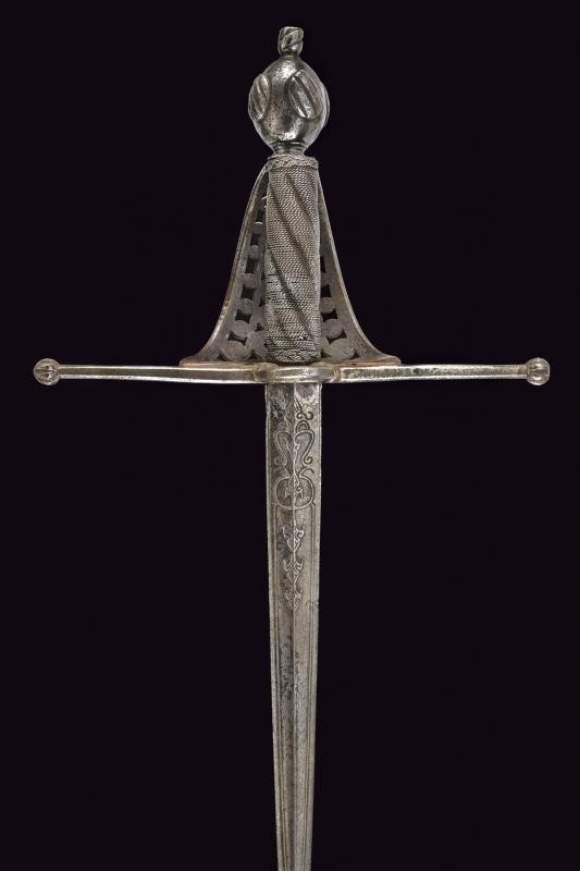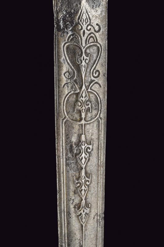 Interessante lama di un pugnale turco con eleganti intagli e nervature. Fornimento in ferro con bracci dell'elso dritti, di sezione quadra e con testa a germoglio. Vela traforata ed incisa. Sul retro un piccolo anello di parata. Pomo ovoidale con quattro cartigli tondeggianti muniti di scanalature oblique. Impugnatura rivestita con trecciola e dotata di teste di moro in filo di ferro, probabilmente di epoca successiva.