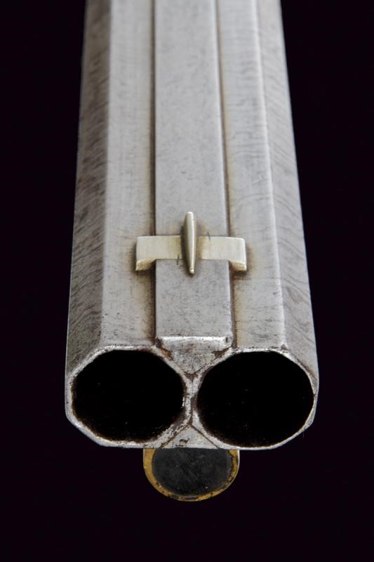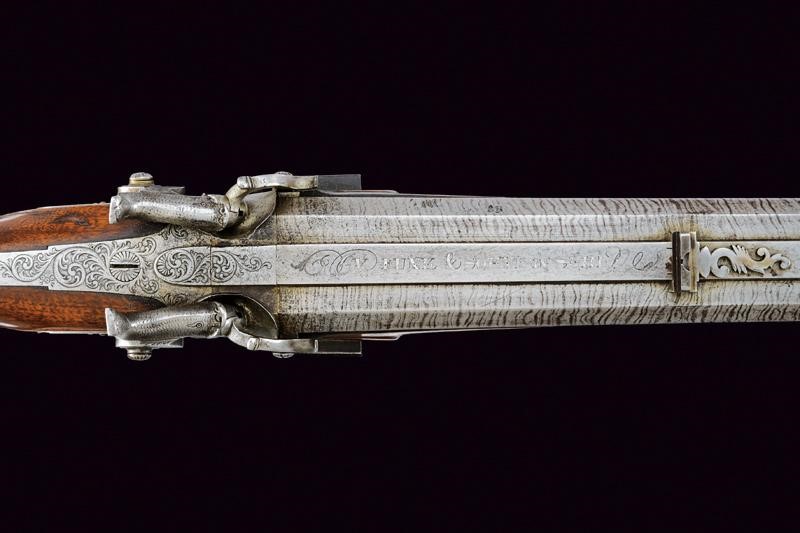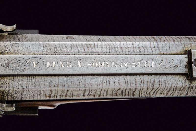 Canne ottagonali, una con rigatura dritta, l'altra con rigatura elicoidale, entrambe con anima pulita e rigatura ben visibile, damascate, con bindella rialzata e piatta, marcata alla base "V. FUNK & SÖHNE IN SUHL" in argento; l'alzo decorato, il mirino in argento; in volata cal 17 mm. Codetta incisa a volute. Batterie a molla in avanti, una marcata "V. FUNK & SÖHNE", l'altra "IN SUHL"; entrambe incise con raffigurazioni di animali nel bosco e disegni floreali; sicure esterne girevoli, dotate di molletta e rotellina, simili alle martelline delle armi a pietra. Mezza cassa in legno con collo zigrinato e poggiaguancia scolpito a fiorame. Patchbox. Fornimenti in ferro decorati en suite. Ponticello con ricciolo traforato. Bacchetta in legno con battipalla in ottone e con cavastracci. Uno dei grilletti con stecher.