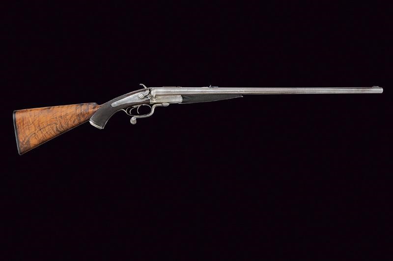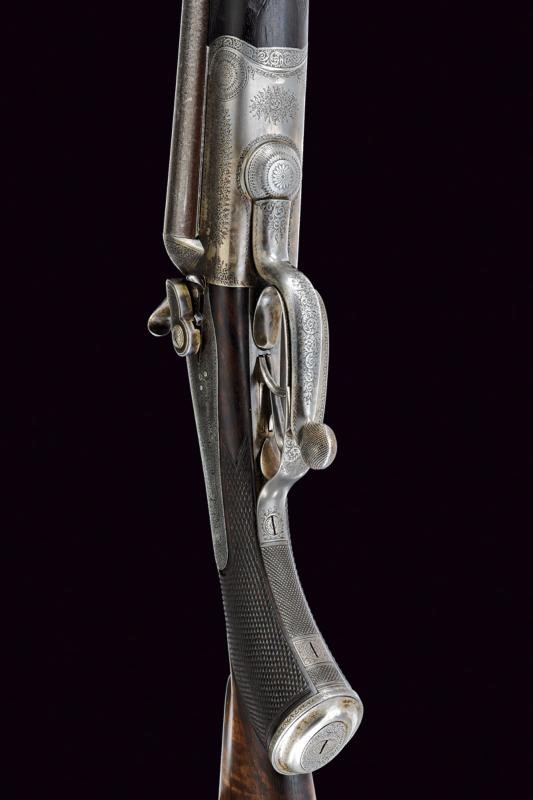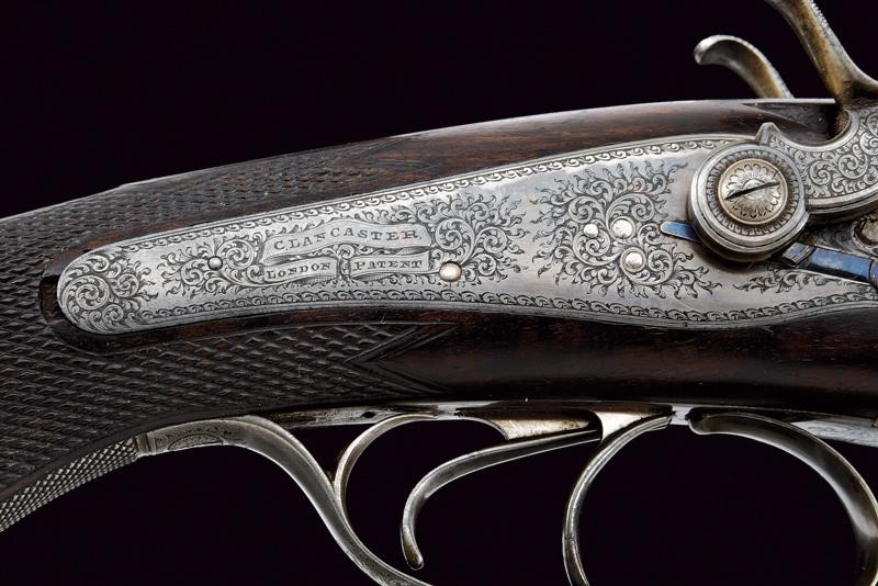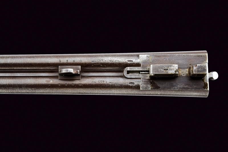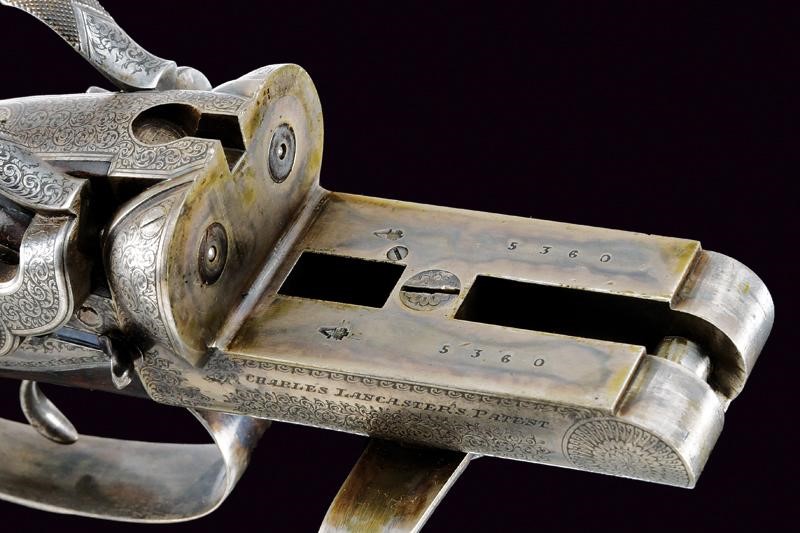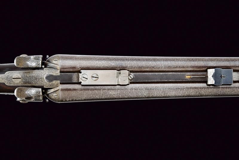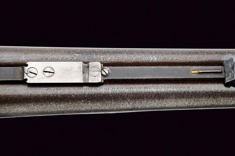 Canne tonde lisce (anime pulite), in damasco brunito, firmate "CHARLES LANCASTER 151 NEW BOND STREET LONDON" e "PATENT SMOOTH BORE. BREECHLOADING RIFLE"; la bindella con la base per un'ottica, alzo a tre foglie, mirino, calibro 450. Sotto alla canna marcatura "450", "CL", due punzoni del banco di prova di Londra e con matricola coeva "53xx". Codetta finemente incisa a volute. Batterie a molla indietro marcate "C. LANCASTER LONDON PATENT"; munite di cani inusuali e sicura. Calcio ed astina in radica con zigrinature. Fornimenti in ferro decorati en suite. Chiave davanti al ponticello, questo recante matricola.