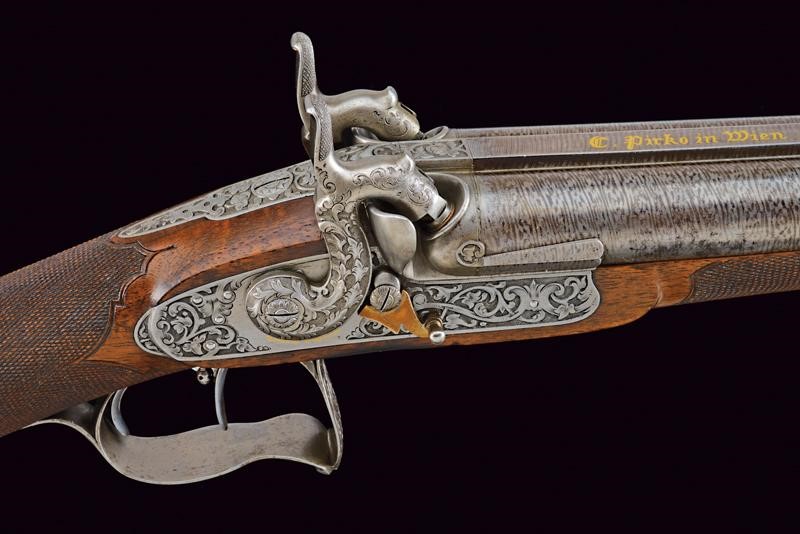 Canne corte, tonde, rigate (anima pulita, rigatura ben visibile), brunite, damascate; munite di alta bindella incisa alla base a fiorame, in seguito firmata "C. Pirko in Wien" in oro, con alzo a tre distanze (50, 200 e 300), mirino di precisione; in volata cal. 17 mm. Codetta finemente incisa a fiorame. Batterie a molla in avanti firmate "CARL PIRKO / IN WIEN" rimesse in oro; cartelle e cani finemente incisi in bassorilievo a motivi floreali su fondo ruvido. Sicura. Meccanica ben funzionante. Casse a tre quarti con astina e collo micro-zigrinati. Fornimenti in ferro decorati en suite. Calciolo con doppio scompartimento, il coperchio inciso e a scomparsa. Stecher funzionante. Bacchetta in ferro con battipalla in ottone.