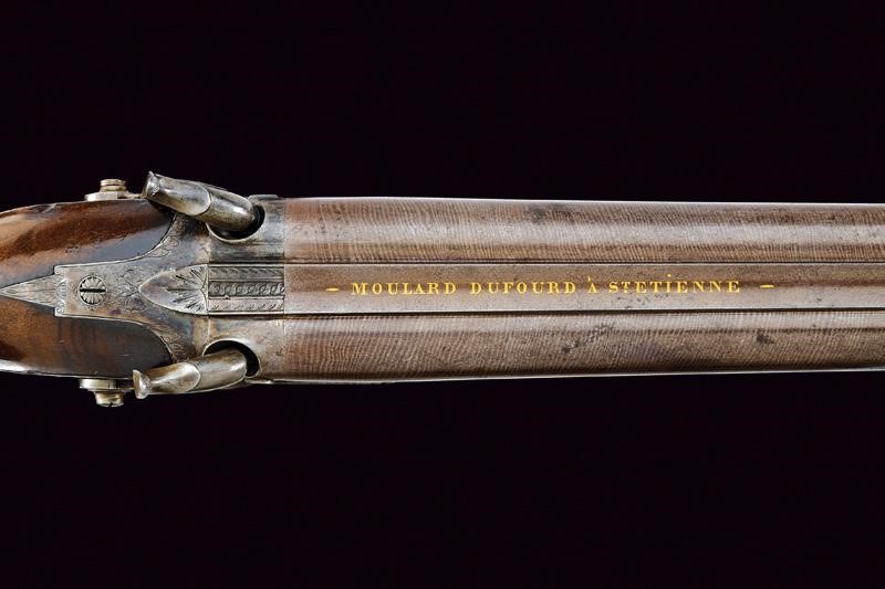 Canne rigate, giustapposte, brunite, damascate, incise alla base, con bindella concava firmata in oro "MOULARD DUFOURD A ST. ETIENNE", mirino, cal. 19 mm. Larga codetta incisa e munita di traguardo. Batterie a molla in avanti incise a motivi floreali. Mezza cassa in radica con astina e collo finemente zigrinati ad intreccio; la parte inferiore del calcio meravigliosamente scolpita con una testa di cinghiale e una rosetta floreale. Fornimenti in ferro; ponticello decorato con un segugio in rilievo, la parte anteriore incisa con un medaglione recante un volatile. Il calciolo inciso a motivi floreali, apribile, e dotata all'interno di due scomparti che contengono rispettivamente un cacciavite e un contenitore cilindrico in legno. L'imbocco della bacchetta in ferro finemente intagliato a testa di lupo. Bacchetta in legno con battipalla in ottone e cavastarcci in ferro.
