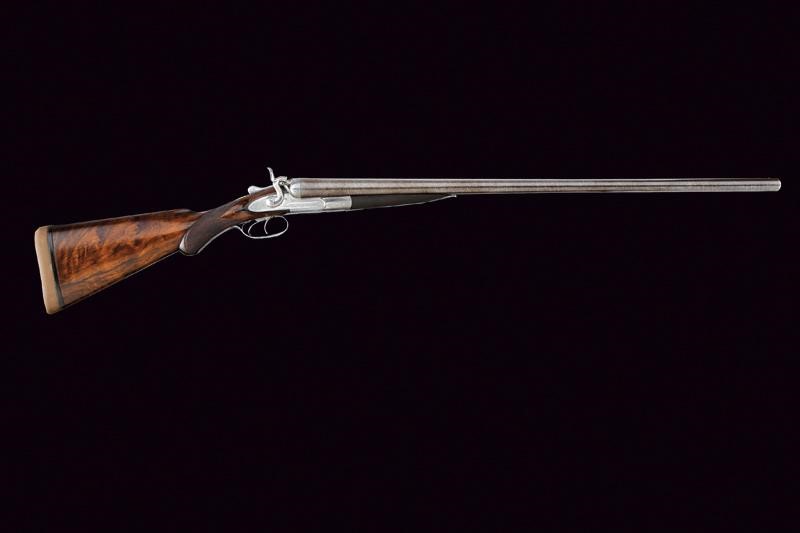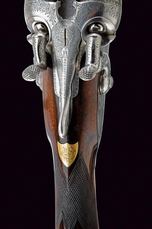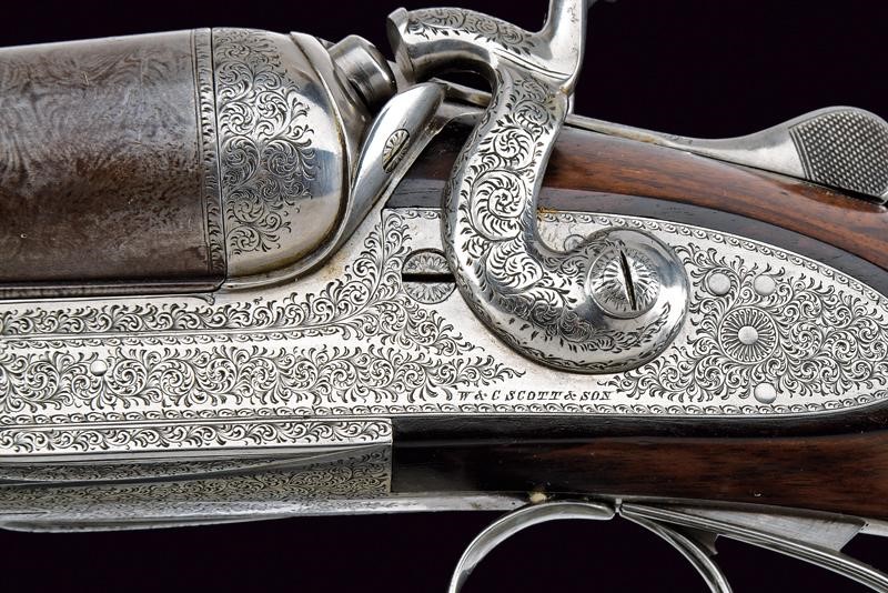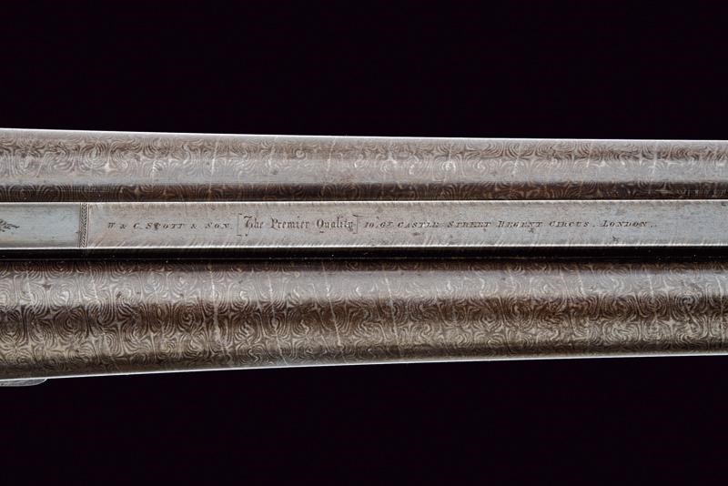 Canne tonde lisce, anime con leggerissimo pitting, in damasco brunito, la bindella incisa alla base a motivi floreali ed in seguito firmata "W. & C. SCOTT & SONS / (The Premier Quality) / 10, G.T CASTLE STREET REGENT CIRCUS LONDON". Calibro 10. Codetta incisa, al di sopra si trova la chiave d'apertura firmata "W. & C. SCOTT & SONS PATENT" ed incisa con effige di una torre e volute. Batterie a molla in avanti firmate e decorate en suite. Calcio ed astina in radica con zigrinature; scudetto in oro con monogramma del proprietario situato sul collo. Fornimenti decorati nello stesso in modo. La coda del ponticello con matricola "No. 77xx". Calciolo in gomma.