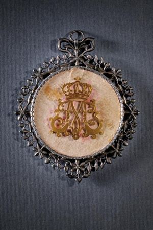 Di forma circolare. Finissimo ritratto di dama in ermellino. La cornice in argento, riccamente traforata e ornata con pietre bianche, recante un anello in smalto color cobalto messo a giorno sotto all'argento. In alto un fiocco e un anello di sospensione. Al rovescio il monogramma reale "M" in oro sormontato da corona traforata, poggiato su una base in tessuto, alla quale un tempo era incollato; il tutto era sicuramente posto sotto vetro (ora mancante); si intravede ancora la sagoma del monogramma impressa sul tessuto.