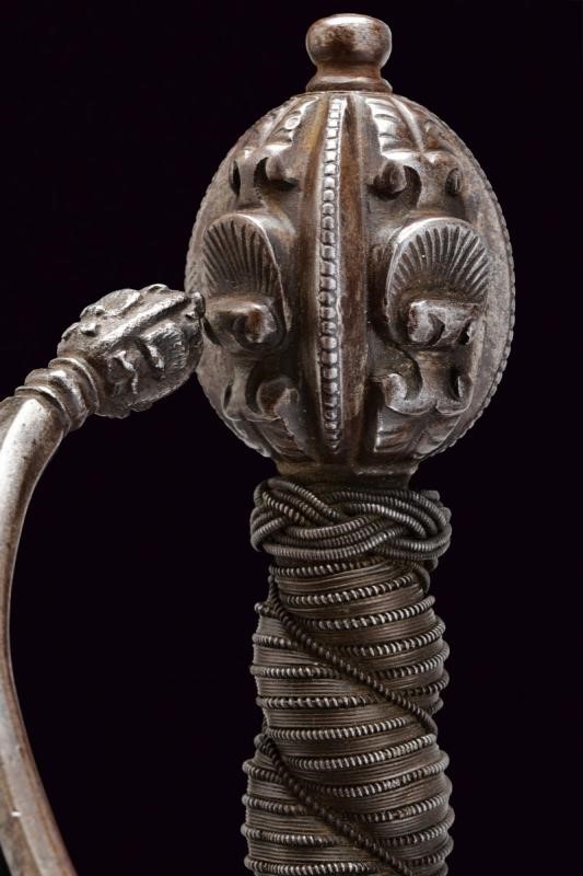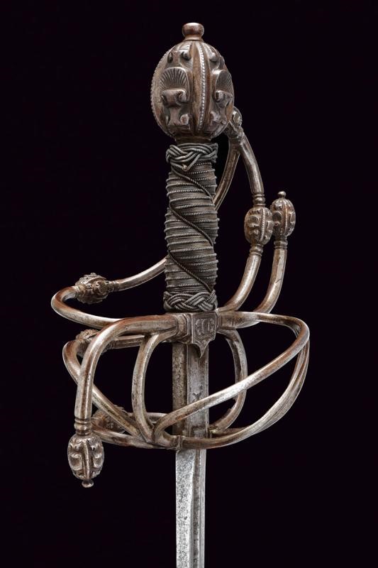 Lama dritta a due fili, sgusciata al forte, con resti di iscrizione poco leggibile; il ricasso delineato ai bordi e con punzoni simili a gigli. Magnifico fornimento in ferro, il ponticello e i rami decorati al centro con nodi ornati con conchiglie in bassorilievo, la stessa decorazione si trova in testa ai bracci dell'elso e del ramo di guardia. L'imponente pomo decorato en suite. Massello appuntito. Impugnatura in legno lavorata a spire, con bellissima trecciola e teste di moro in filo di ferro.