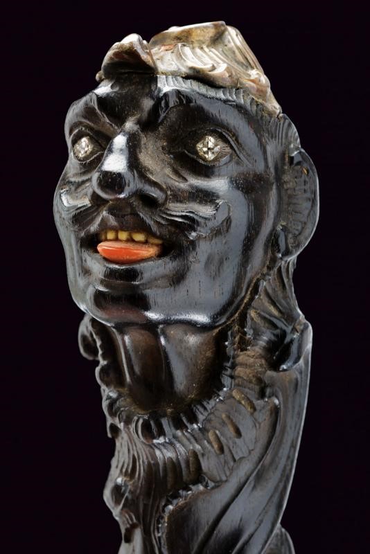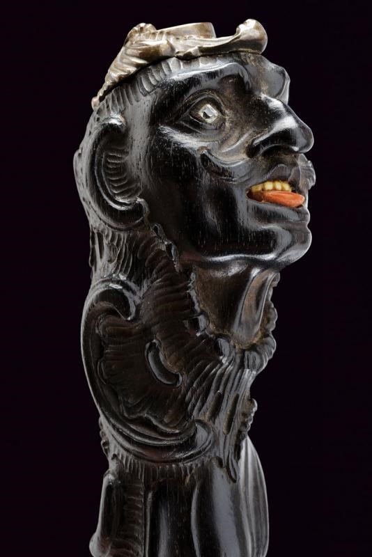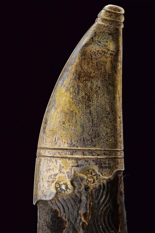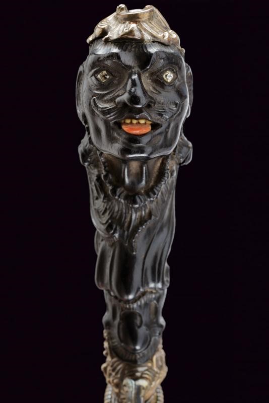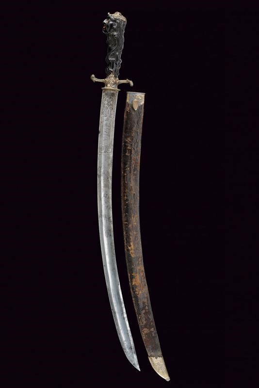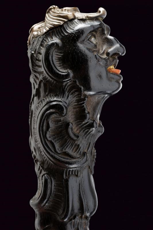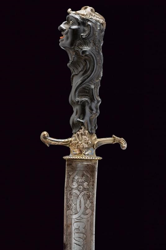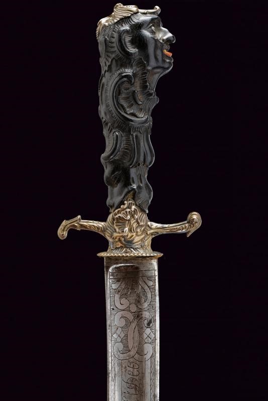 Lama curva a un filo e controfilo, con ampio sguscio e breve tallone; la prima parte incisa a bande e marcata su un lato "Soli Deo" e "Gloria" sull'altro. Impugnatura in ebano maestosamente scolpito con un volto al pomo con occhi in simil diamanti, denti in osso e con lingua rossa, la base lavorata a testa di segugio, la parte centrale a rocaille; elso e cappa in argento sbalzato a rocaille e munito di due punzoni, uno del fabbricante "ICW", l'altro con data "1760". Completo di fodero in legno rivestito di cuoio (mancanze) decorato a onde; fornimenti in argento, incisi e muniti dei medesimi punzoni.
