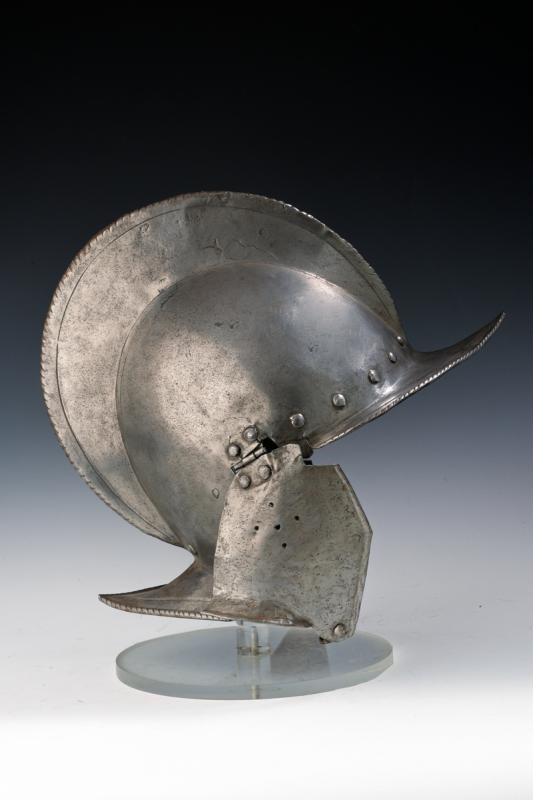 Coppo lavorato in un sol pezzo, con cresta di forma tondeggiante, ben rilevata a bordo lavorato a fingere il tortiglione e con delineature. La tesa aguzza e slanciata lievemente incurvata verso l'alto, con sottile margine a lista ribassata e cordone lavorato a fingere il tortiglione. Resti di una marca accanto al cordone stesso. La gronda lavorata en suite. I guanciali probabilmente di sostituzione antica. All'interno tracce di vecchi coietti sotto ai ribattini. Bel profilo slanciato.