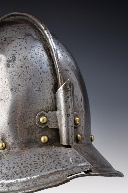 Coppo in ferro lavorato in due metà con tesa spiovente a bordo ribassato e orlato; la sommità con piccola cresta, la base della calotta con giro di rivetti in ottone; sul lato posteriore una pennacchiera. All'interno resti dei coietti per il fissaggio della fodera. Piccoli danni e mancanze.