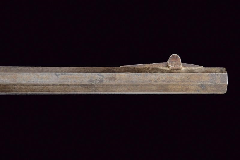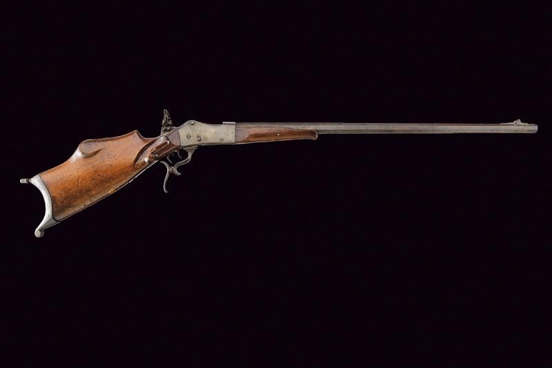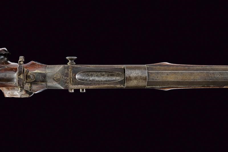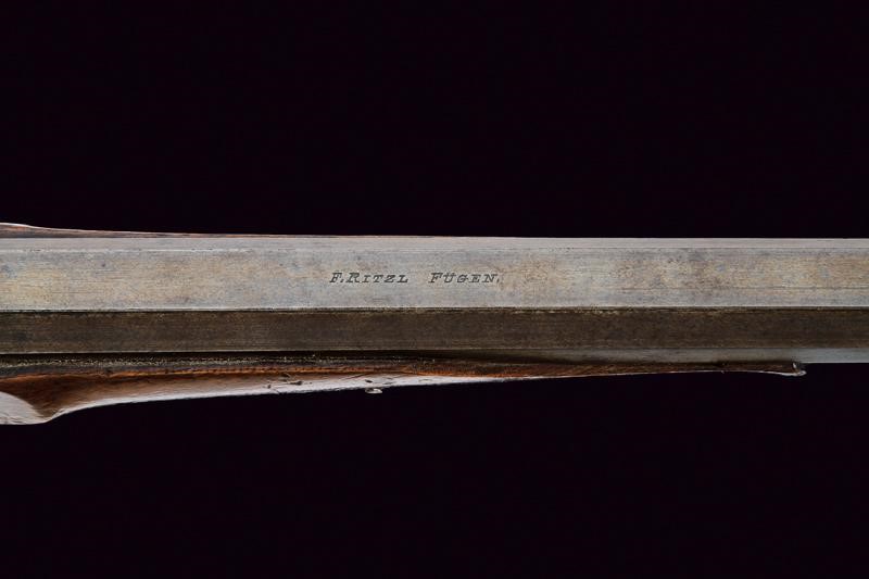 Pesante canna ottagonale, rigata (anima con leggero pitting, rigatura visibile); il segmento iniziale con bindella firmata "F. RITZL FÜGEN"; in volata il mirino, cal. 8 mm. Castello liscio con tipico otturatore a blocco basculante; meccanica funzionate. Calcio ed astina in legno (piccole mancanze, segni d'uso e del tempo); la codetta con diottra. Fornimenti in ferro, ponticello con poggiadito; stecher funzionante. In patina, da pulire.