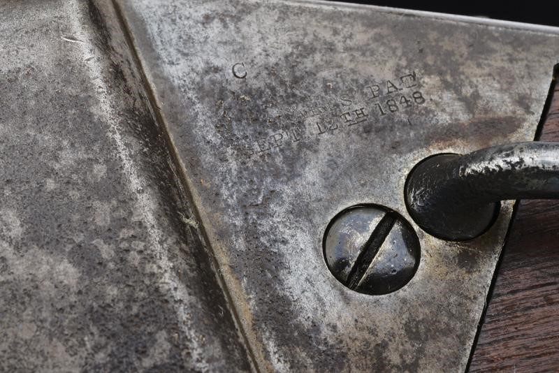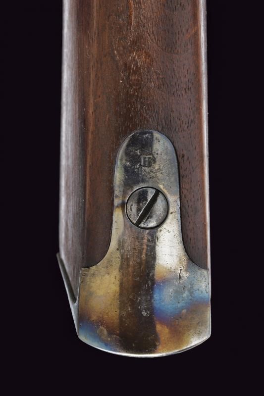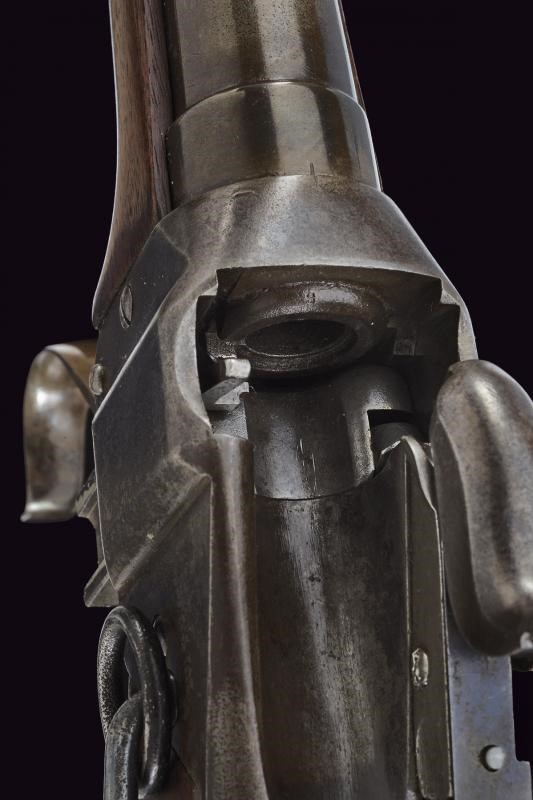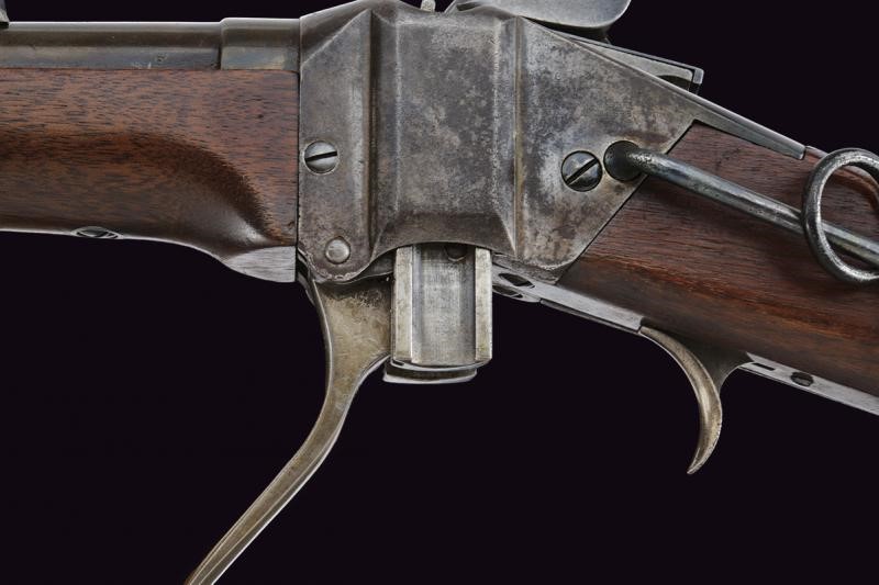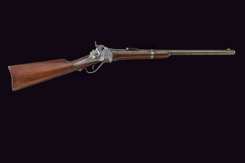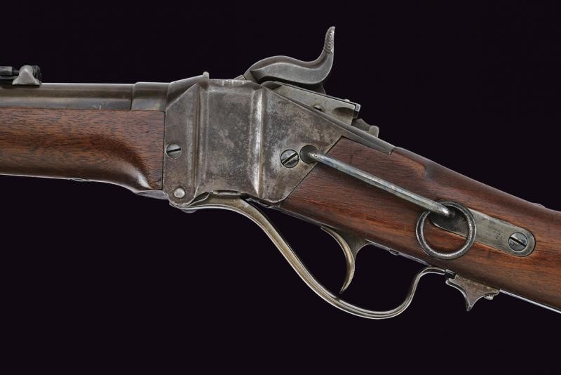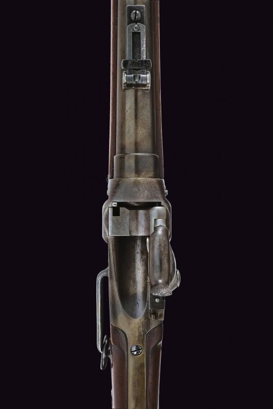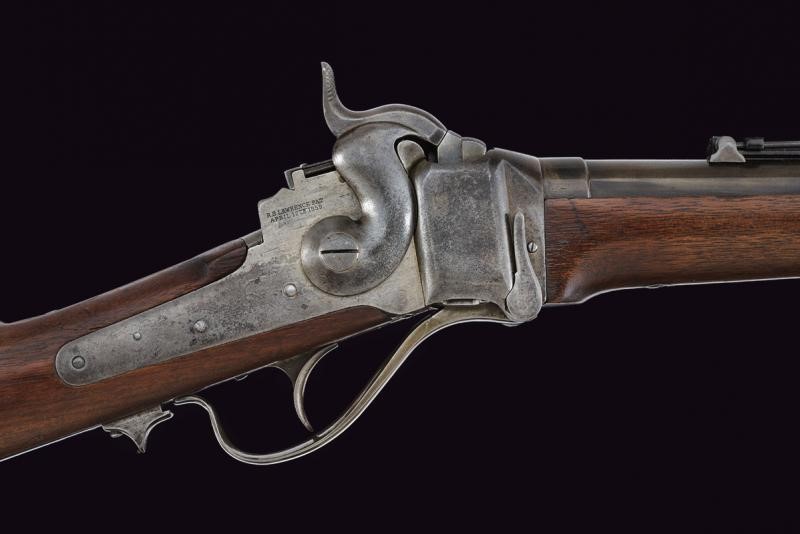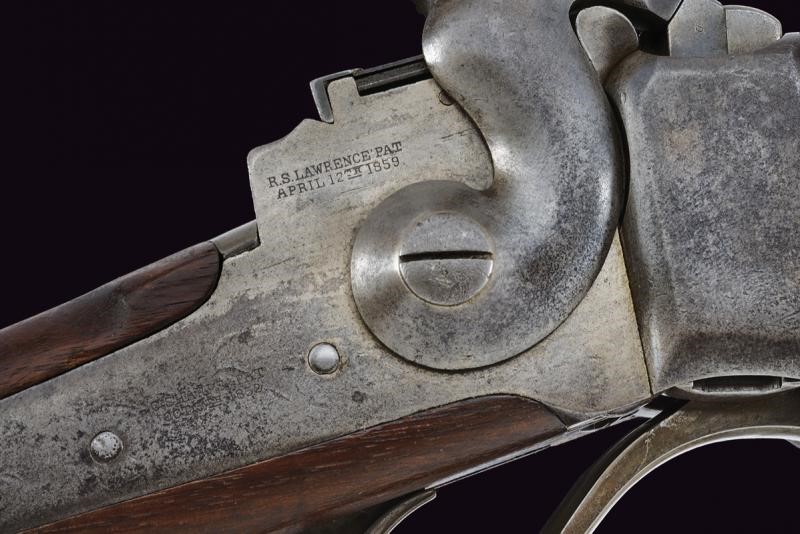 Canna tonda rigata, munita di mirino ed alzo regolabile, marcata alla base con brevetto Lawrence del 1859 e con punzone "F", cal. 50. Castello in ferro con brevetto Sharps del 1852 e di Lawrence del 1859, marcatura sulla contropiastra con brevetto Sharp's del 1848. Apertura dell'otturatore (punzone "C") a leva. Meccanica funzionante. Calcio ed astina in legno liscio; la contropiastra con barra e anello da sella; calciolo in ferro. Senza matricola.