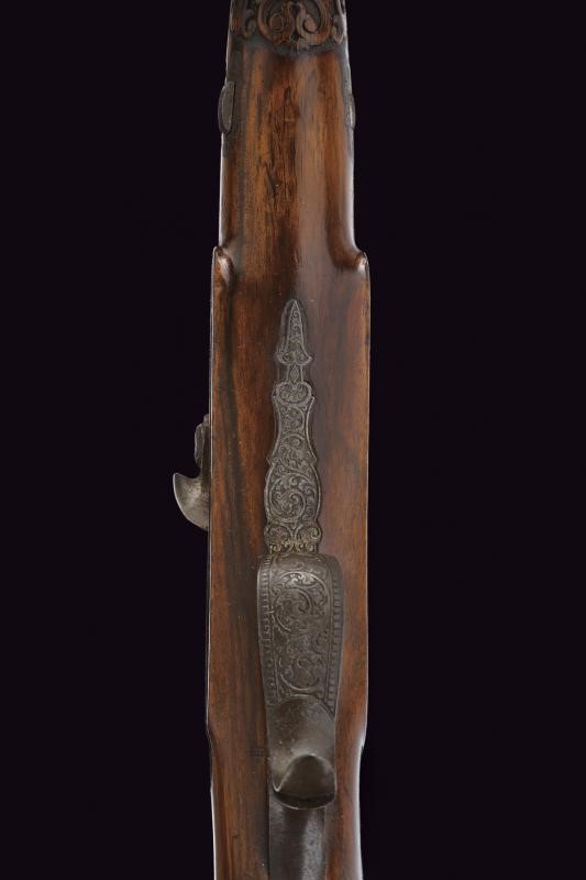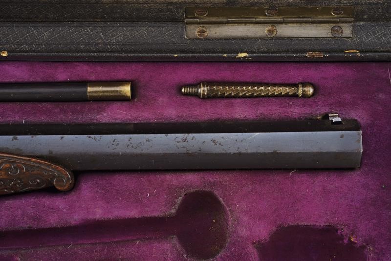 Interessante cassetta in legno, rivestita in cuoio (difetti e mancanze) decorato a motivi geometrici, il coperchio con placca ovale al centro. L'interno foderato in panno bordeaux. Contenente resti di una bella pistola a luminello in condizioni molto buone, avente canna ottagonale, rigata, brunita, firmata in oro "A. ZOLLER FRAUENFELD" e "ACIER FONDU", base incisa a volute; mirino di precisione, cal. 10 mm; codetta finemente incisa e con alzo regolabile; il pistone e la batteria mancanti; mezza cassa in legno con muso e calcio scolpiti; fornimenti in ferro decorati en suite; ponticello con poggiadito e stecher. Inoltre si trovano all'interno vari accessori originali, fra i quali anche la chiave per la regolazione dell'alzo.