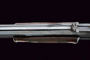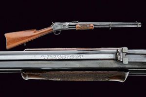 Canna tonda rigata, da 20", dotata di mirino e munita di un alzo abbattibile e regolabile, recante solo parte della dicitura dorsale, la marcatura del calibro sinistro "44 Cal." presente. Anima pulita, rigatura visibile, qualche leggera zona di pitting all'interno. Due fascette reggicanna, una con passante. Castello con tracce di cavallino rampante, codolo inferiore totalmente privo di numerazione, mai inciso, recante il punzone "S". Calcio liscio, astina zigrinata, entrambi in noce, con segni d'uso e del tempo. Meccanica funzionante. Sicura di blocco del sistema di caricamento a pompa collocata a fianco del ponticello. Brunitura color blu (d'epoca?). Anello da sella.
