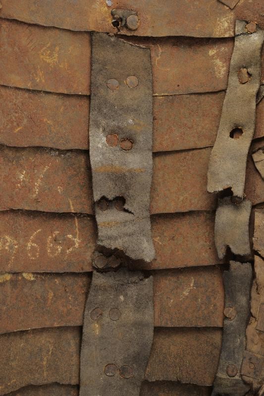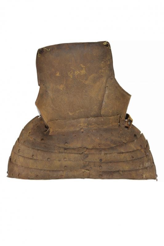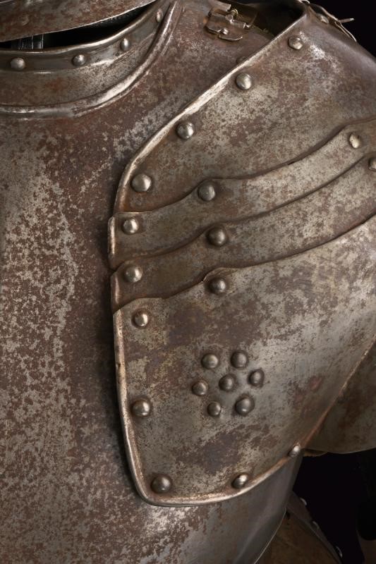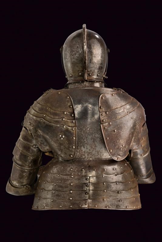 Completa di elmo alla savoiarda, petto, schiena, gola, bracciali completi con manopole e scarselle a tredici lame. Restauri, difetti e mancanze. Manichino non incluso.