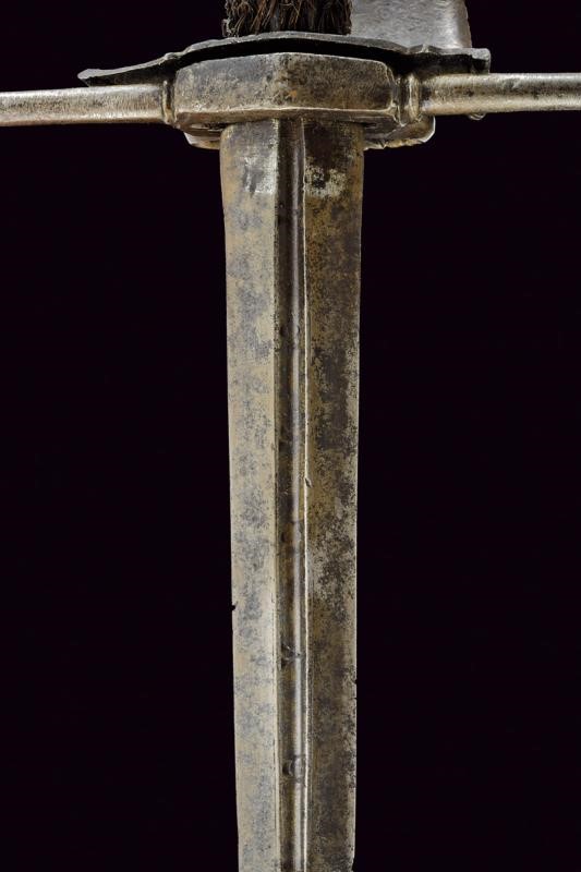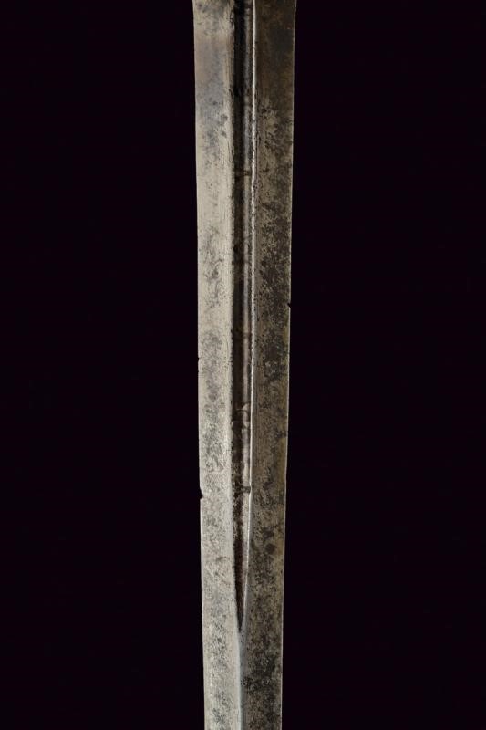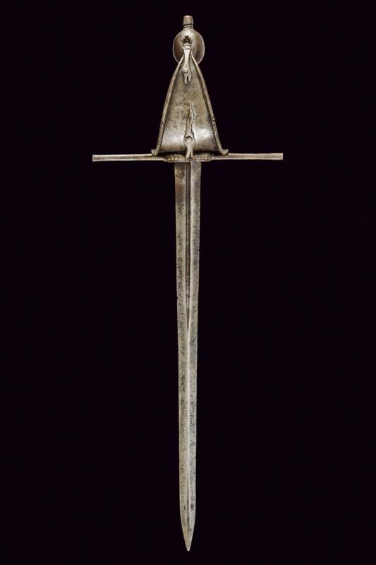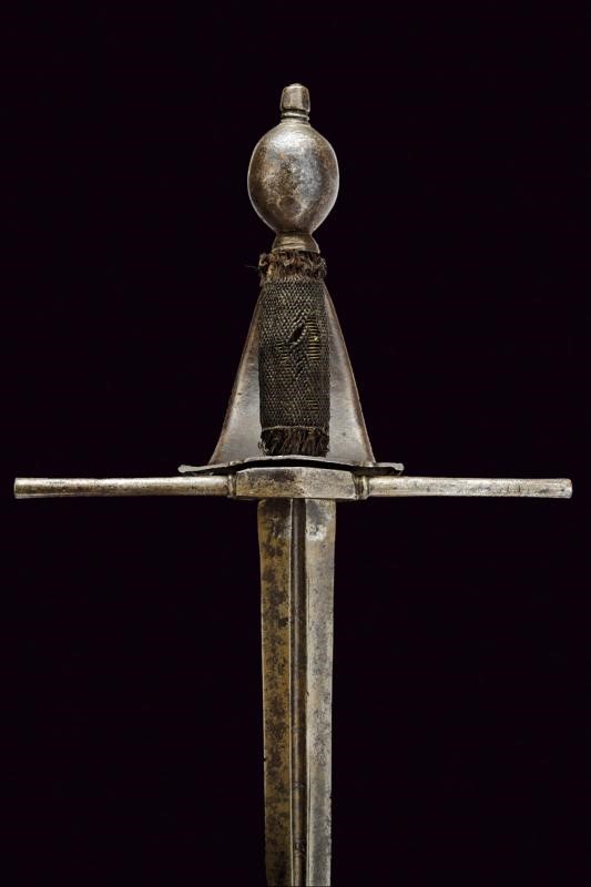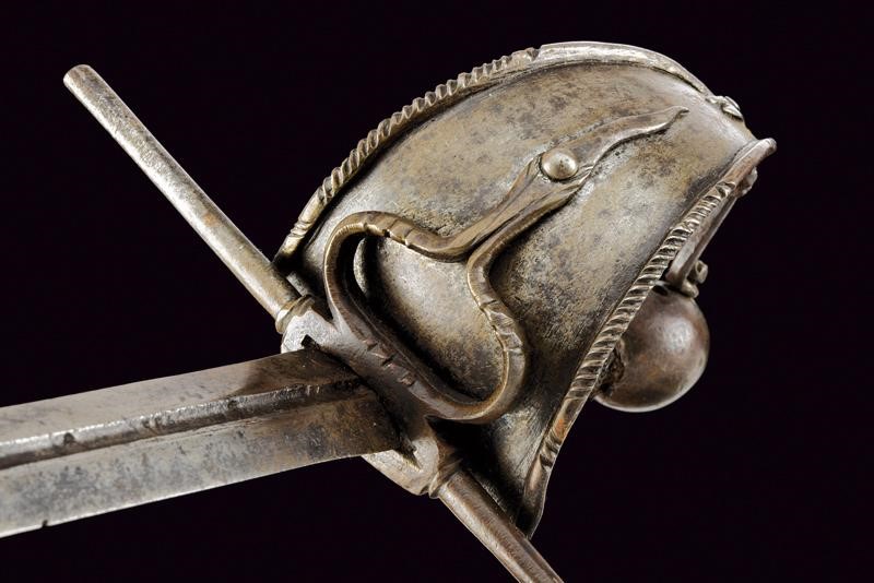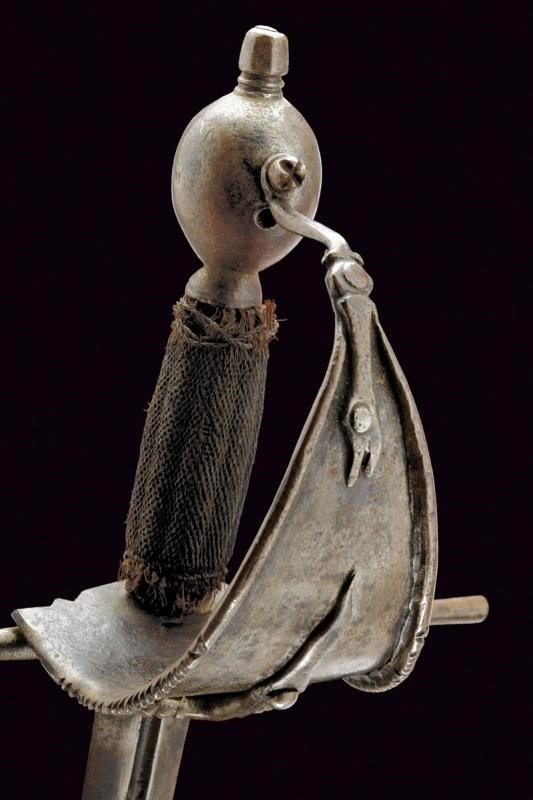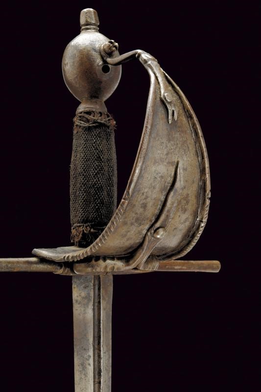 Lama dritta a due fili di sezione a losanga con scanalatura alla base recante resti di iscrizione. Fornimento in ferro, la vela liscia con bordi alzati e parzialmente lavorato a fingere il tortiglione, sul massello un anello ovale con coda lavorato a stilizzare la coda di un serpente, dalla parte superiore arriva la testa del serpente, la vela fissata sul pomo ovale con una vite, un foro per una seconda vite (per un arco all'interno della vela?). Impugnatura in legno rivestito da un bel rivestimento in fine trecciola metallica (mancanze) con resti di teste di moro.