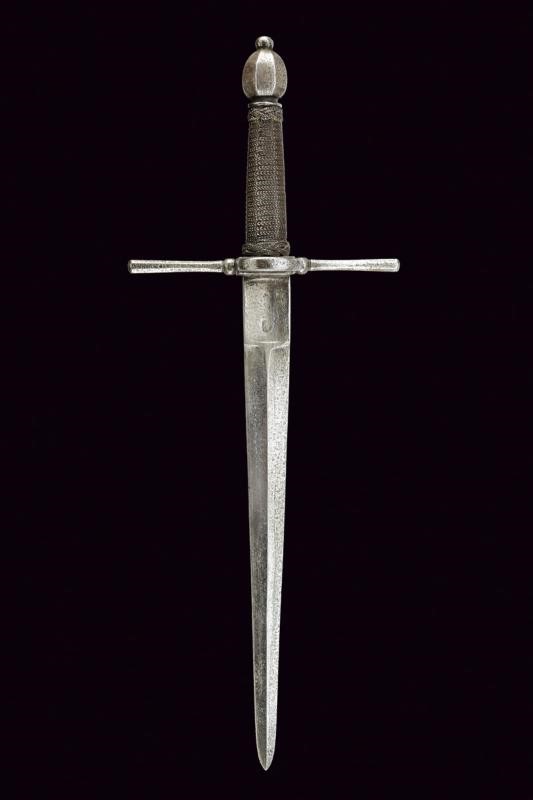 Lama dritta a due fili a sezione di losanga, con due marche sul lato di terza e tallone rettangolare leggermente convesso. Fornimenti in ferro, bracci dell'elso dritti e faccettati; anello di parata. Pomo faccettato. Impugnatura in legno con trecciola e teste di moro in filo di ferro.