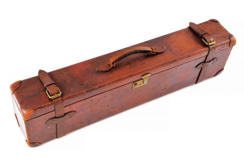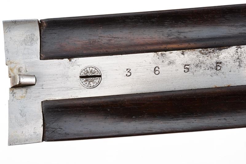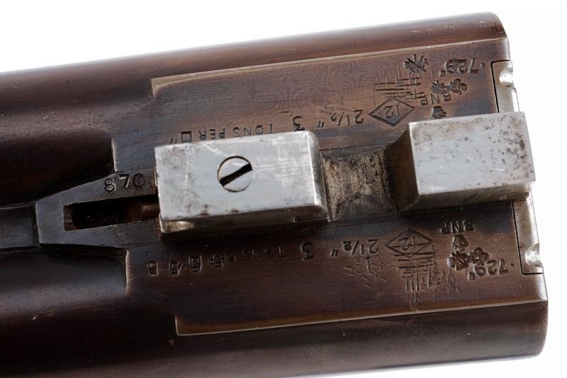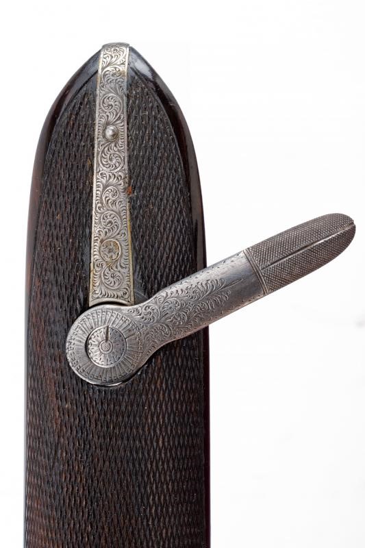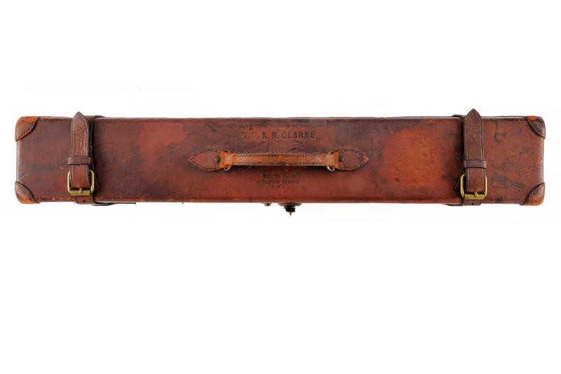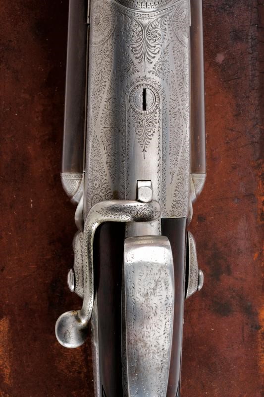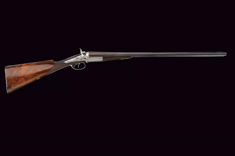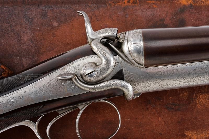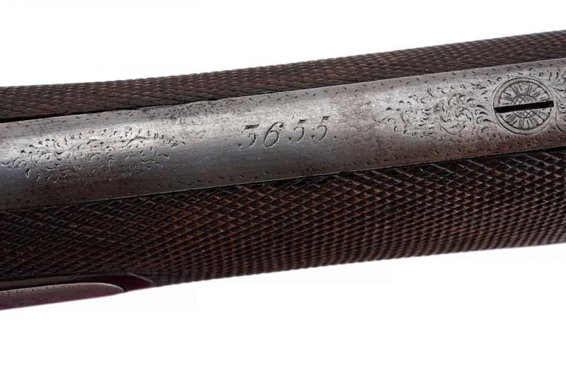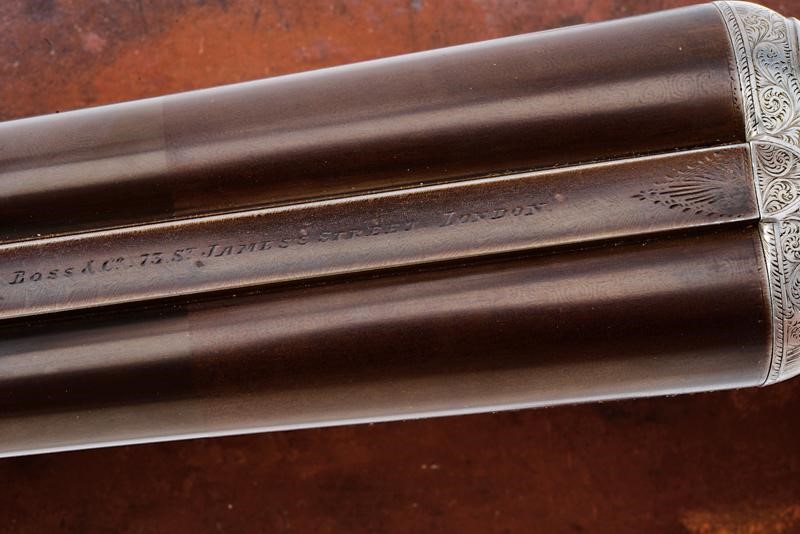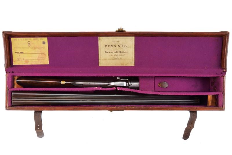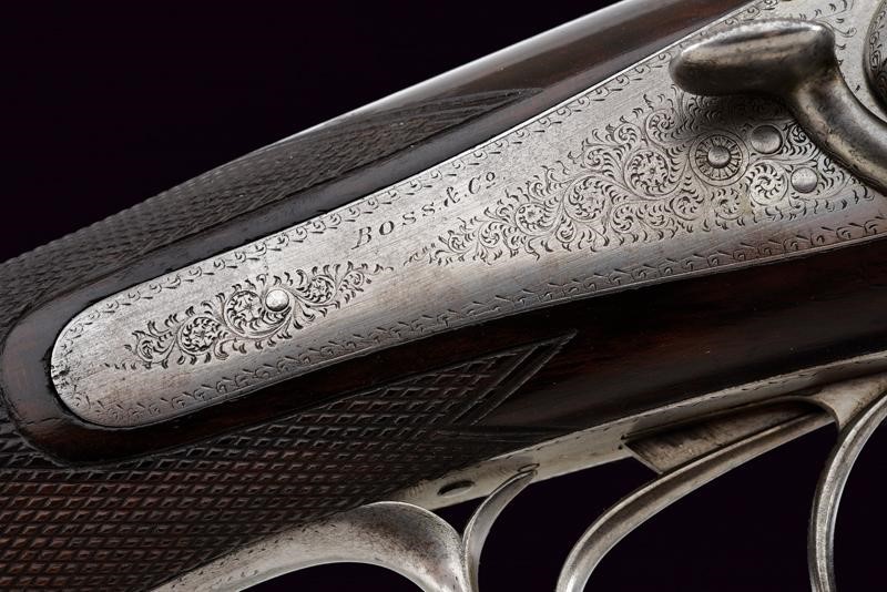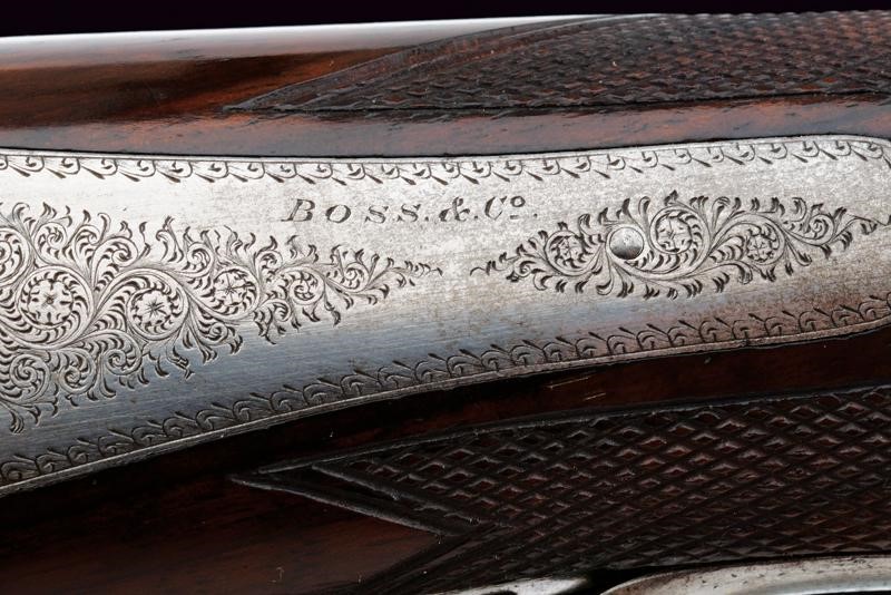 Canne tonde lisce (con anime pulite), brunite; la bindella in damasco marcata "BOSS & C.o 73 ST. JAMES'S STREET LONDON"; mirino, cal 12. Codetta finemente incisa a volute. Batterie a molla indietro firmate "BOSS & C.o"con cartella incisa a volute. Chiave posta nella parte inferiore con braccio che termina nella cartella destra. Calcio ed astina in legno con zigrinature. Fornimenti in ferro incisi, codolo del ponticello con matricola "56xx". Scudetto ovale posto nella parte inferiore del calcio. Meccanica funzionante. Nella sua cassetta originale in cuoio, la quale originalmente conteneva un coppia di doppiette; il coperchio esterno marcata "R. C. R. M. CLARKE", l'interno con etichetta del fabbricante.