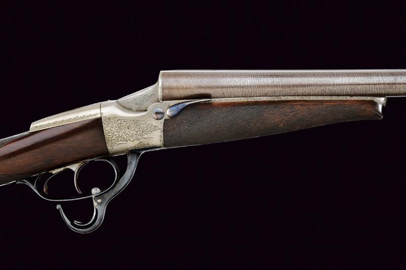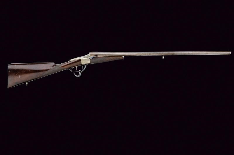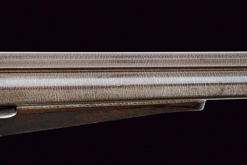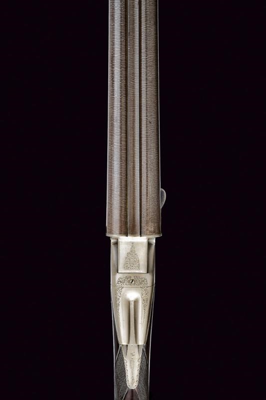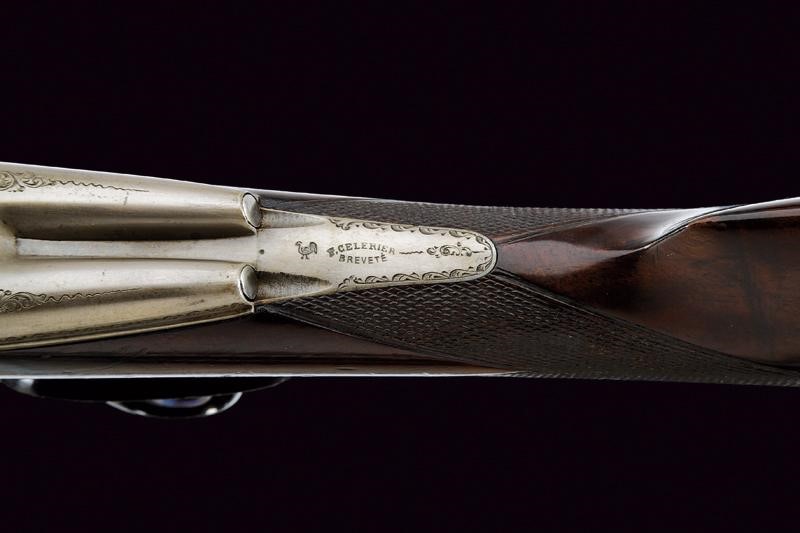 Canne tonde lisce con bella finitura damascata all'esterno e bindella con mirino in ottone, Cal. 16. Anime lisce ben conservate, con minimi segni del tempo. Le canne fisse, con otturatore a blocco rotante. La chiave, posta anteriormente al ponticello è munita di una levetta di sgancio; quando azionata, la chiave abbassa il blocco dell'otturatore e arma i percussori, che sono divisi in più segmenti. Il castello con fini incisioni a racemi. Il collo con marcatura "E. CELERIER BREVETE". Meccanica ben funzionante. Calcio ed astina in noce con zigrinature. Fornimenti in ferro. Ponticello, leva e calciolo mantengono buona parte della brunitura antica color blu.