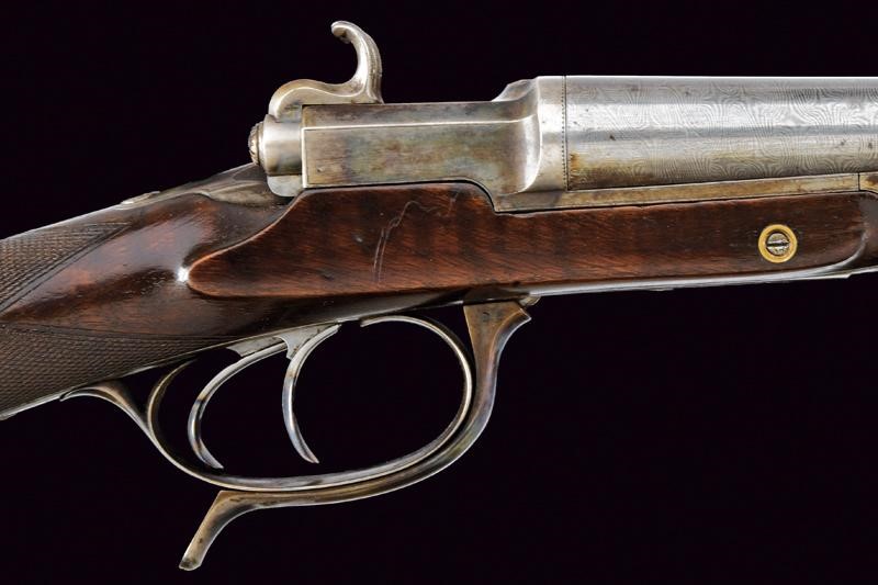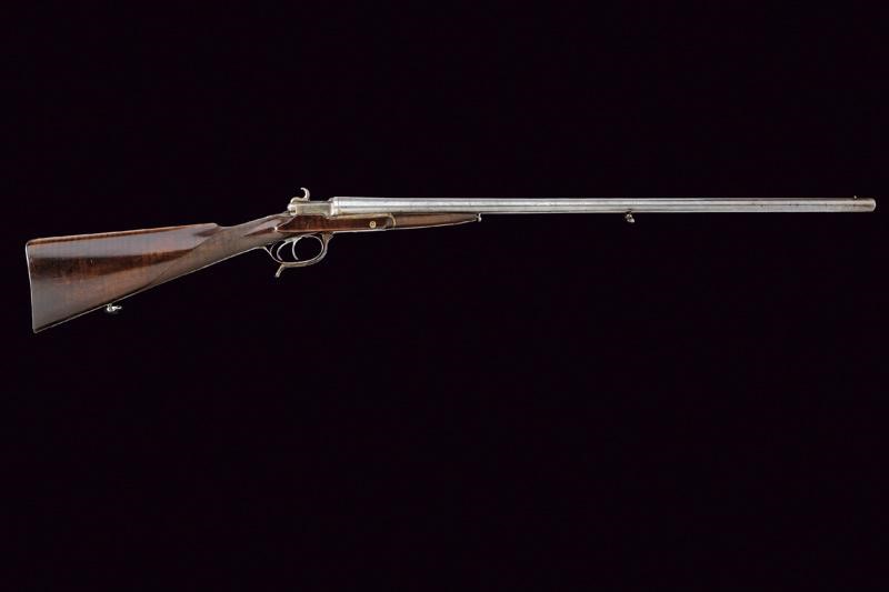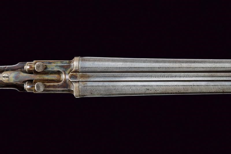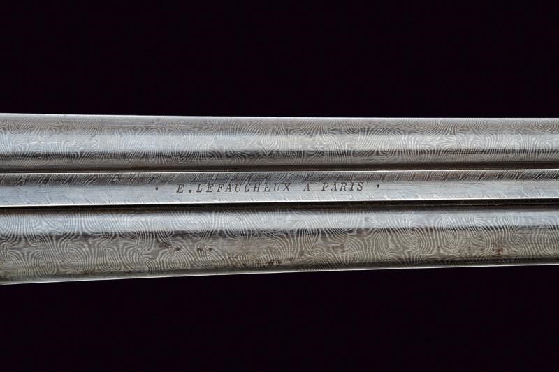 Canne tonde lisce, con bindella marcata "E. LEFAUCHEUX A PARIS" e dotata di mirino in ottone. Cal. 16. Anime ben conservate, con minimi segni del tempo. La superficie con resti di finitura in damasco. La bascula con apertura rotativa. La chiave, posta anteriormente al ponticello, permette con un unico movimento di sbloccare le canne e armare i percussori. Questi hanno un movimento assiale e sono incassati entro appositi alloggamenti in un blocco retrostante le culatte, entrambi i percussori sono muniti di cane con cresta, per essere armati autonomamente. Le meccaniche ben funzionanti. Il blocco di culatta con resti di tartarugatura. Calcio ed astina in noce. Fornimenti in ferro dotati di viti incise, anche questi con resti di tartarugatura.