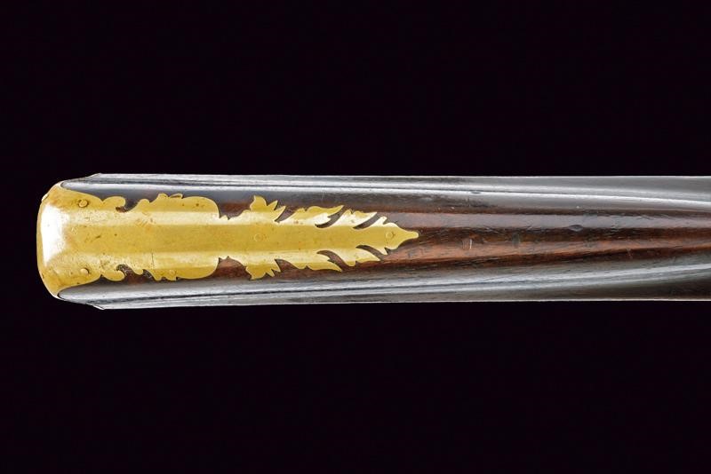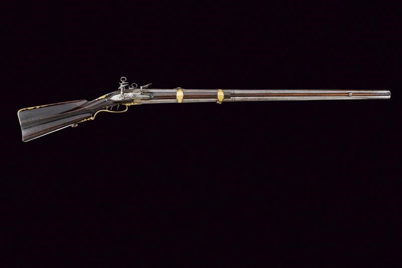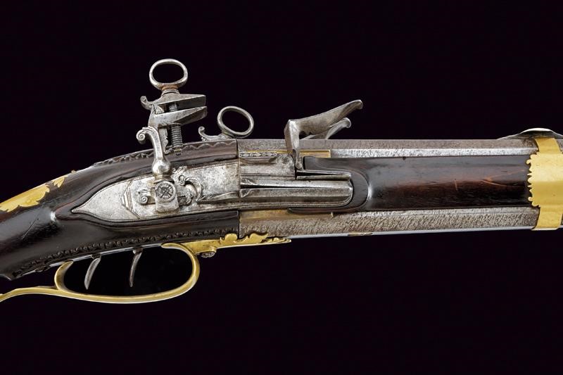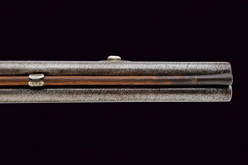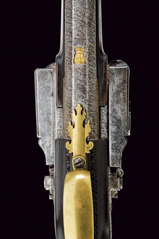 Eleganti canne lisce a due ordini lavorate a torcione, entrambe ottagonli e tonde, con anellature al cambio e cal. 15,5 mm. in volata. Quella superiore con le marche rimesse in rame dorato: "PISTOIA" coronata e una a leone. Mirino e alzo in argento. La canna inferiore con la sola marca "PISTOIA" sempre dorata e coronata. Le snelle batterie con molle leggermente differenti per il diverso posizionamento delle canne. Con piccole incisioni floreali. Sul margine inferiore della cartella destra la firma "Guardiani", sull'altra "Anghiari". Calcio ed astina in legno. Fornimenti lisci in ottone. Bacchetta in legno.