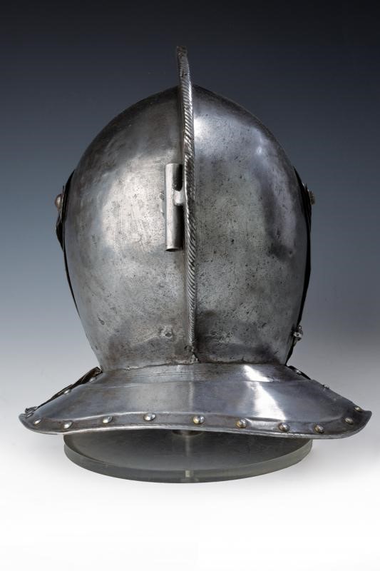 Coppo in ferro lavorato in due pezzi con bassa cresta lavorata a fingere il tortiglione. Visiera appuntita, costolata e lavorata, come la cresta, a fingere il tortiglione, due fessure oculari rettangolari. Ventaglia costolata e con rosetta traforata su entrambi i lati. Barbozza liscia dotata del gancio di chiusura. Due lame di guardacollo e due di gronda; quelle più esterne probabilmente di epoca leggermente più tarda, aventi margini ribassati e bordi lavorati a fingere il tortiglione; con coietti moderni. Restauri, piccoli difetti e mancanze. La parte posteriore con pennacchiera.