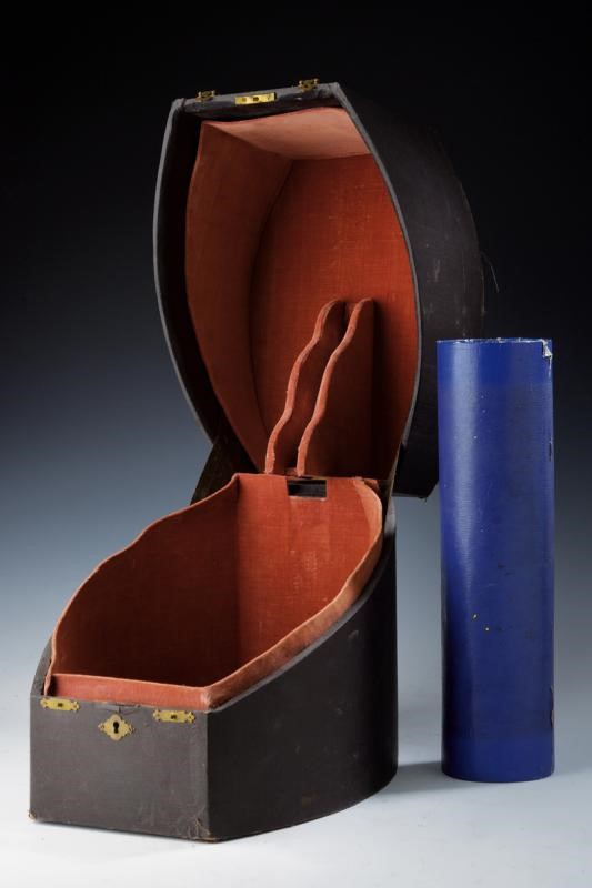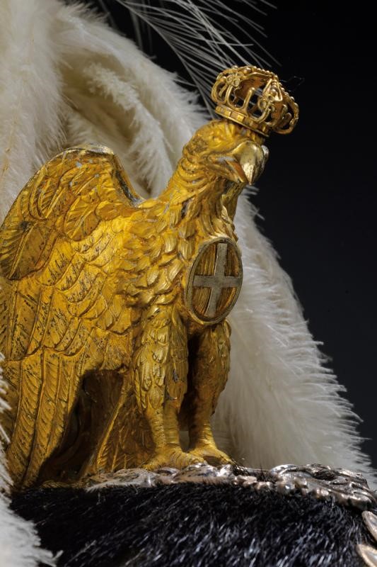 Coppo rivestito con pelliccia nera di foca (lacune e mancanze), tipico cimiero in ottone messo a giorno e dorato come pure l'aquila, questa lavorata a tutto tondo e caricata sul petto da croce in argento. Coccarda tricolore in seta e canutiglia argento. Tutti i fornimenti argentati, compresi i soggoli a squame e la raggiera frontale (con punzone di argentiere); stellone dorato recante il monogramma del re Vittorio Emanuele III. Interno con visiere in marocchino scuro come pure l'alluda, cuffie in seta rossa. Completo di bel piumaggio originale. Entro la sua bella custodia da viaggio in legno rivestito di marocchino nero con interno in velluto leggermente sbiadito.