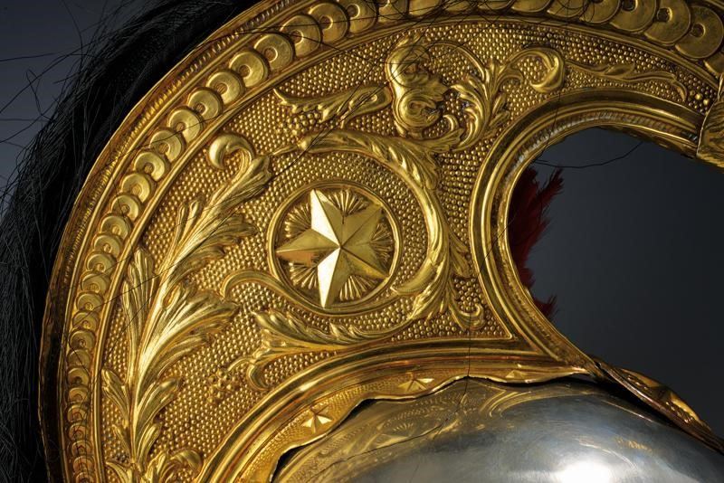 Coppo in alpacca con fornimenti in ottone ben dorato, cimiero con tipici decori stampati in rilievo, ceffo a teste di leone con coda nera. Oliva con stella, raggiera dorata sormontata da trofeo d'armi in metallo argentato. Tipici soggoli a squame con orecchioni tondi con stella; coccarda tricolore in cotone, pennacchio originale rosso e bianco. Interno con visiere in marocchino bruno, alluda in coietto chiaro lavorato a spicchi. Il coppo marcato sotto il cimiero con il punzone di Eugenio Capriolo, capo armaiolo dei corazzieri.