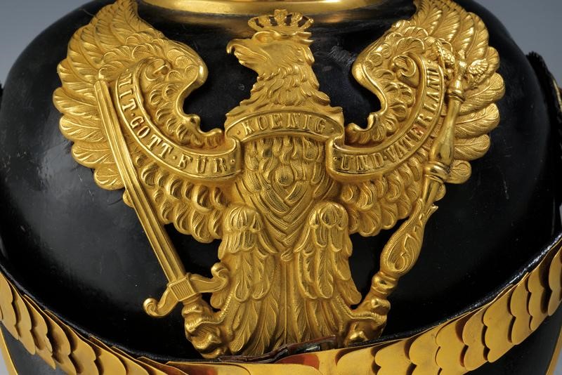 Coppo in cuoio laccato nero con visiera tondeggiante, fornimenti in ottone dorato. Cuspide liscia su disco con rivetti a stella. Aquila da ufficiale. Soggolo corazzato con scaglie piatte, su entrambi i lati le coccarde. All'interno alluda in pelle con danni, doppi buchi, cuffia mancante.