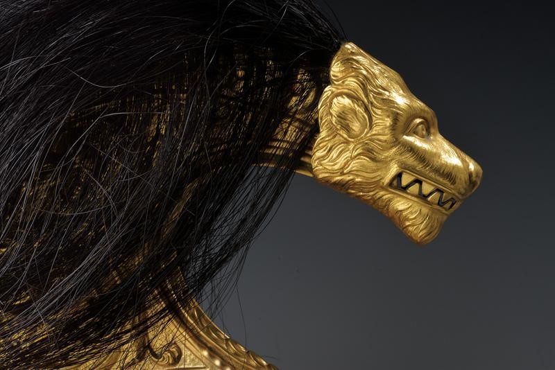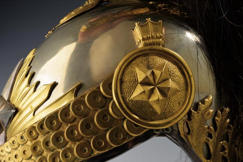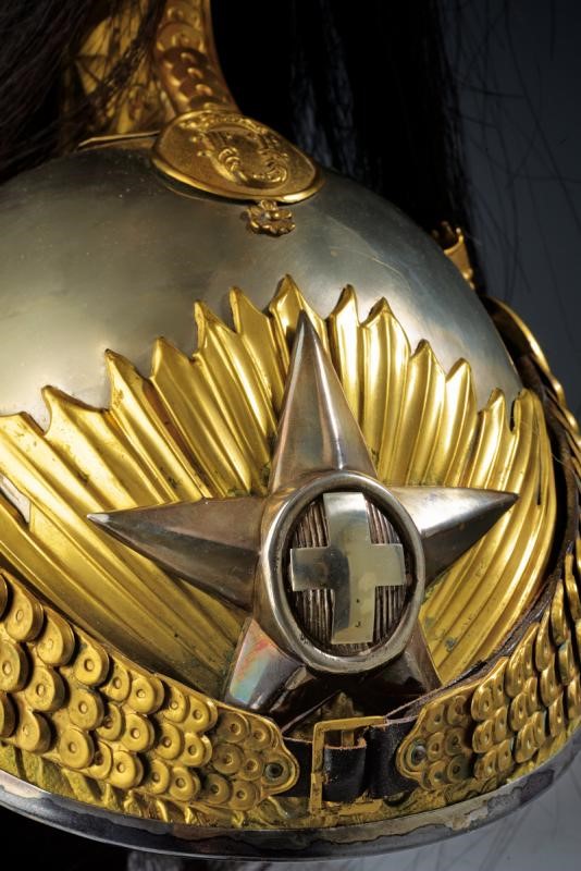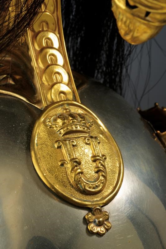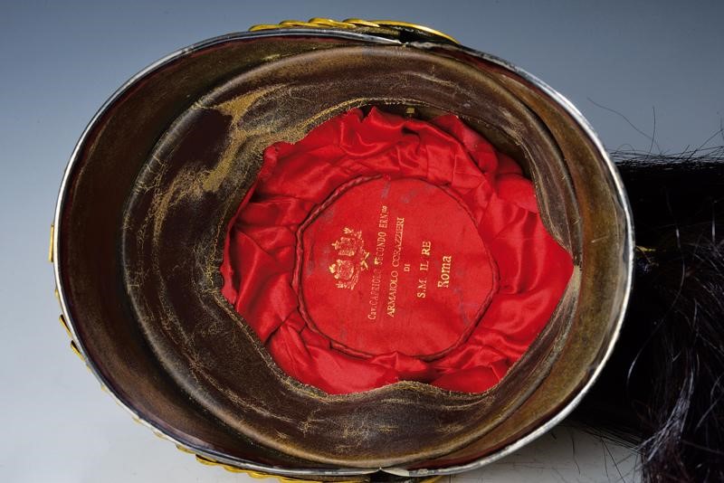 Coppo in alpacca, tipico cimiero stampato a rilievo e dorato recante l'oliva con il monogramma coronato del re Umberto I; raggiera frontale, soggoli a squame, orecchioni con stella, fregio a fronde sul retro e portapennacchio sempre in ottone dorato. Interno con visiere in pelle marrone come pure l'alluda, cuffia in seta rossa recante impresso in oro il nome del fabbricante "Cav Capriolo Secondo Ern.sto - Armaiolo Corazzieri - di S.M. IL RE - Roma". Completo di ceffo a testa leonina con coda di crine nero.